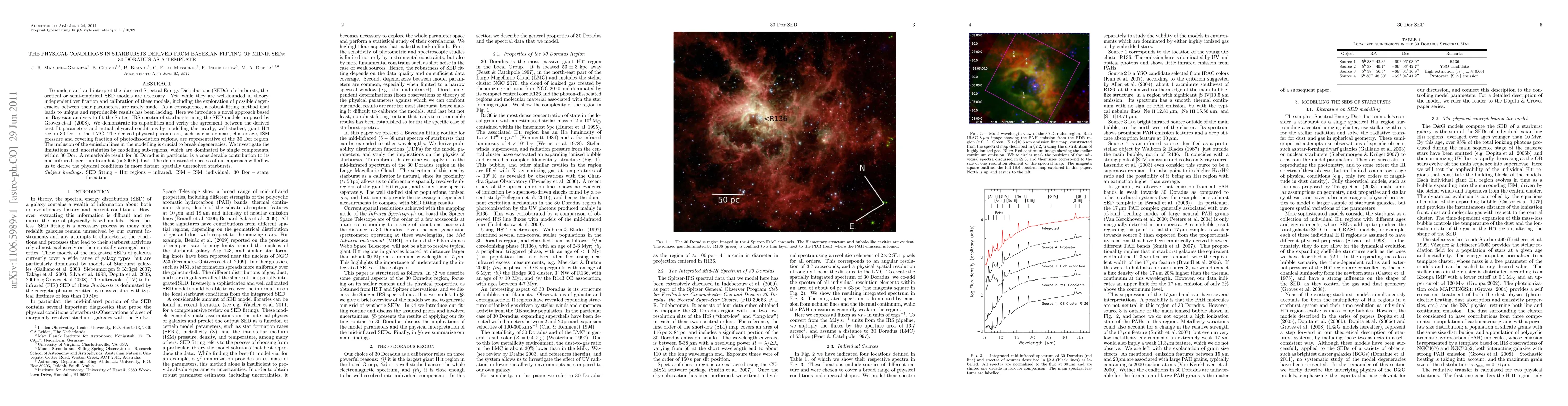 To understand and interpret the observed Spectral Energy Distributions (SEDs) of starbursts, theoretical or semi-empirical SED models are necessary. Yet, while they are well-founded in theory, independent verification and calibration of these models, including the exploration of possible degeneracies between their parameters, are rarely made. As a consequence, a robust fitting method that leads to unique and reproducible results has been lacking. Here we introduce a novel approach based on Bayesian analysis to fit the Spitzer-IRS spectra of starbursts using the SED models proposed by Groves et al. (2008). We demonstrate its capabilities and verify the agreement between the derived best fit parameters and actual physical conditions by modelling the nearby, well-studied, giant HII region 30 Dor in the LMC. The derived physical parameters, such as cluster mass, cluster age, ISM pressure and covering fraction of photodissociation regions, are representative of the 30 Dor region. The inclusion of the emission lines in the modelling is crucial to break degeneracies. We investigate the limitations and uncertainties by modelling sub-regions, which are dominated by single components, within 30 Dor. A remarkable result for 30 Doradus in particular is a considerable contribution to its mid-infrared spectrum from hot ({\simeq} 300K) dust. The demonstrated success of our approach will allow us to derive the physical conditions in more distant, spatially unresolved starbursts.