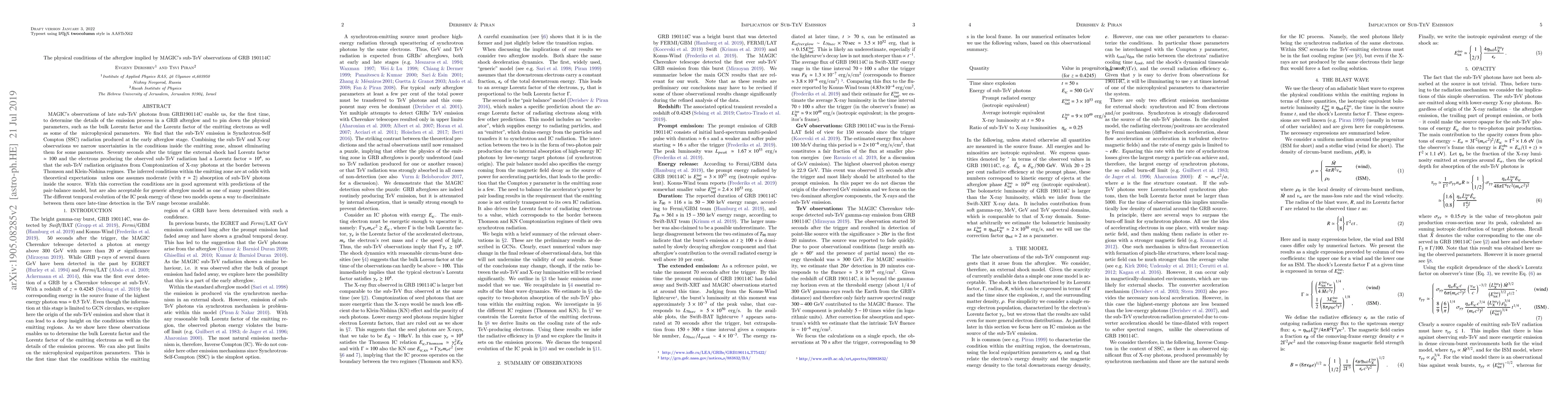 The MAGIC observations of late sub-TeV photons from GRB190114C enable us, for the first time, to determine the details of the emission process in a GRB afterglow and to pin down the physical parameters, such as the bulk Lorentz factor and the Lorentz factor of the emitting electrons as well as some of the microphysical parameters. We find that the sub-TeV emission is an Inverse Compton radiation produced at the early afterglow stage. Combining the sub-TeV and X-ray observations we narrow uncertainties in the conditions inside the emitting zone, almost eliminating them for some parameters. Seventy seconds after the trigger the forward shock had Lorentz factor $\simeq 100$ and the electrons producing the observed sub-TeV radiation had a Lorentz factor $\simeq 10^4$, so that the sub-TeV radiation originates from Comptonization of X-ray photons at the border between Thomson and Klein-Nishina regimes. The inferred conditions within the emitting zone are at odds with theoretical expectations unless one assumes moderate (with $\tau \simeq 2$) absorption of sub-TeV photons inside the source. With this correction the conditions are in good agreement with predictions of the pair-balance model, but are also acceptable for generic afterglow model as one of many possibilities. However, the temporal evolution of the Inverse Compton peak energyis very different in these two models. This opens a way to discriminate between the models once late-time detection in the TeV range become available.