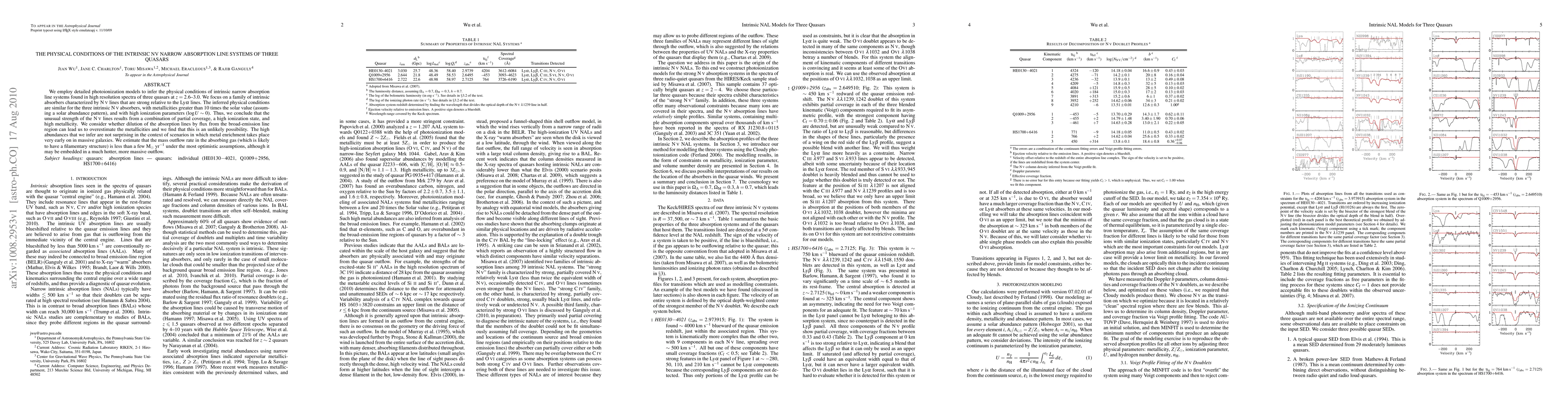 We employ detailed photoionization models to infer the physical conditions of intrinsic narrow absorption line systems found in high resolution spectra of three quasars at z=2.6-3.0. We focus on a family of intrinsic absorbers characterized by N V lines that are strong relative to the Ly-alpha lines. The inferred physical conditions are similar for the three intrinsic N V absorbers, with metallicities greater than 10 times the solar value (assuming a solar abundance pattern), and with high ionization parameters (log U ~ 0). Thus, we conclude that the unusual strength of the N V lines results from a combination of partial coverage, a high ionization state, and high metallicity. We consider whether dilution of the absorption lines by flux from the broad-emission line region can lead us to overestimate the metallicities and we find that this is an unlikely possibility. The high abundances that we infer are not surprising in the context of scenarios in which metal enrichment takes place very early on in massive galaxies. We estimate that the mass outflow rate in the absorbing gas (which is likely to have a filamentary structure) is less than a few solar masses per year under the most optimistic assumptions, although it may be embedded in a much hotter, more massive outflow.