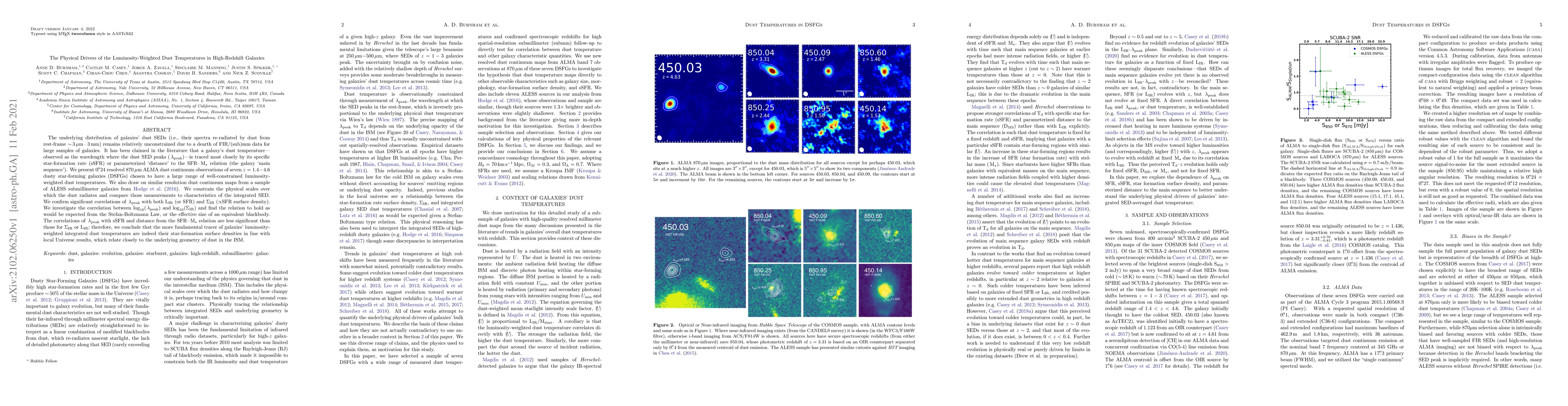 This study, using ALMA observations, confirms that high-redshift galaxies' dust temperatures, indicated by peak wavelength ($lambda_{peak}$) in their SEDs, correlate strongly with star-formation surface density ($Sigma_{ m IR}$). This relationship aligns with the Stefan-Boltzmann Law, suggesting that the dust radiation area is the key factor. Correlations with sSFR or distance from the SFR-M* relation were less significant, indicating that $Sigma_{ m IR}$ is a more fundamental tracer of luminosity-weighted dust temperatures in these galaxies.