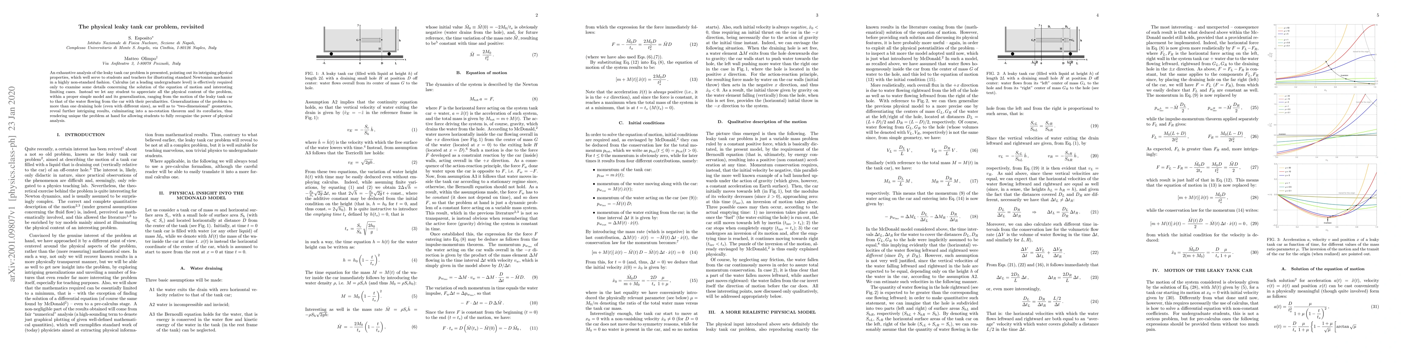 An exhaustive analysis of the leaky tank car problem is presented, pointing out its intriguing physical properties, which well serve to students and teachers for illustrating standard Newtonian mechanics in a highly non-standard fashion. Calculus (at a leading undergraduate level) is effectively required only to examine some details concerning the solution of the equation of motion and interesting limiting cases. Instead we let any student to appreciate all the physical content of the problem, within a proper simple model and its generalization, ranging from the motion of the leaky tank car to that of the water flowing from the car with their peculiarities. Generalizations of the problem to more than one draining hole (even with different sizes), as well as to "two-dimensional" geometries, reveal further intriguing results, culminating into a no-rotation theorem and its corollaries, thus rendering unique the problem at hand for allowing students to fully recognize the power of physical analysis.