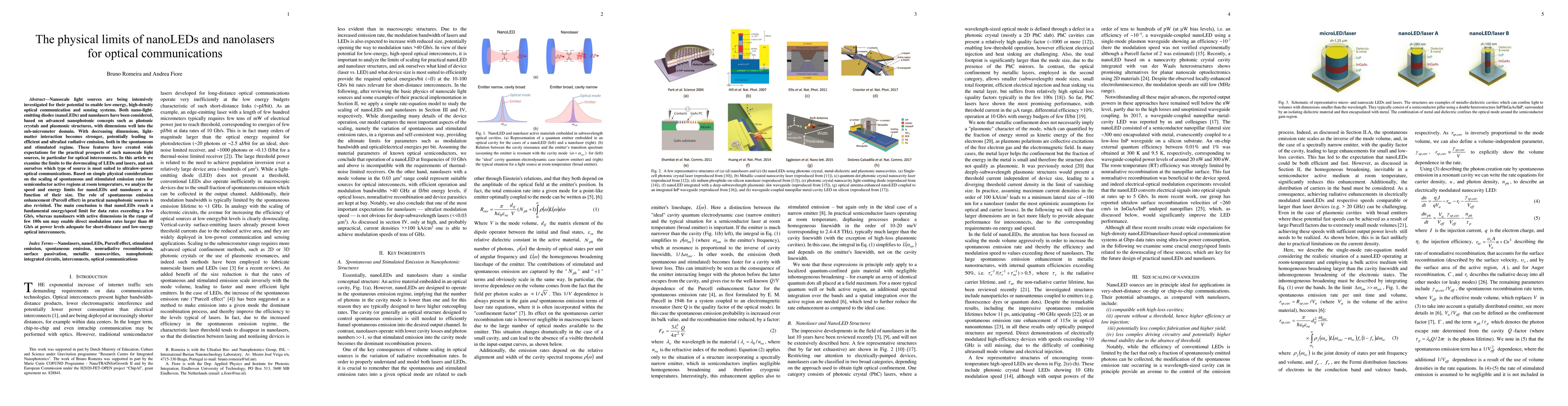 This paper investigates the physical limits of nanoLEDs and nanolasers for optical communications, finding that nanolasers with dimensions in the range of 100s nm can achieve modulation rates exceeding 40 Gb/s at low power, while nanoLEDs face fundamental energy/speed limits for data rates above a few Gb/s.