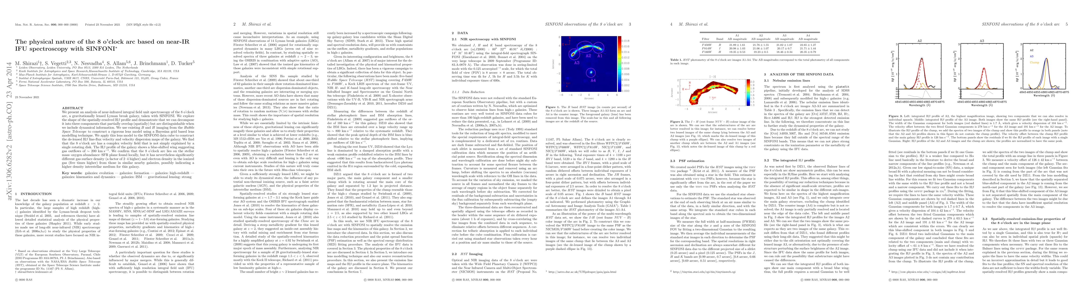 This study uses near-IR IFU spectroscopy with SINFONI to analyze the 8 o'clock arc, a gravitationally lensed galaxy, revealing a complex velocity field and gas outflows. The analysis shows the galaxy's H\beta profile exhibits a blue-shifted wing, indicating higher gas surface density and electron density compared to similar nearby galaxies.