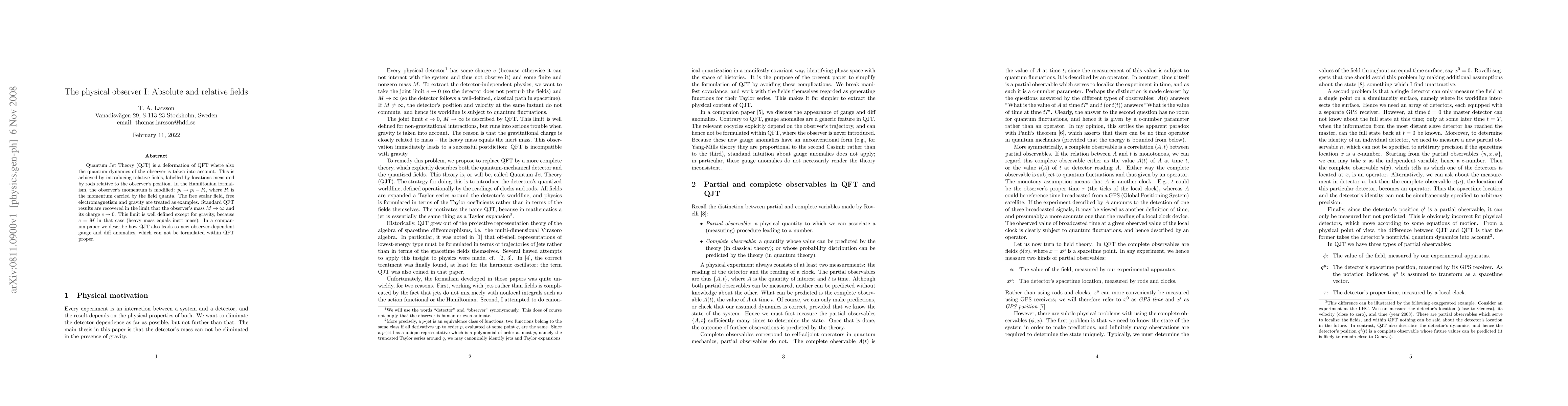 Quantum Jet Theory (QJT) is a deformation of QFT where also the quantum dynamics of the observer is taken into account. This is achieved by introducing relative fields, labelled by locations measured by rods relative to the observer's position. In the Hamiltonian formalism, the observer's momentum is modified: p_i \to p_i - P_i, where P_i is the momentum carried by the field quanta. The free scalar field, free electromagnetism and gravity are treated as examples. Standard QFT results are recovered in the limit that the observer's mass M \to \infty and its charge e \to 0. This limit is well defined except for gravity, because e = M in that case (heavy mass equals inert mass). In a companion paper we describe how QJT also leads to new observer-dependent gauge and diff anomalies, which can not be formulated within QFT proper.