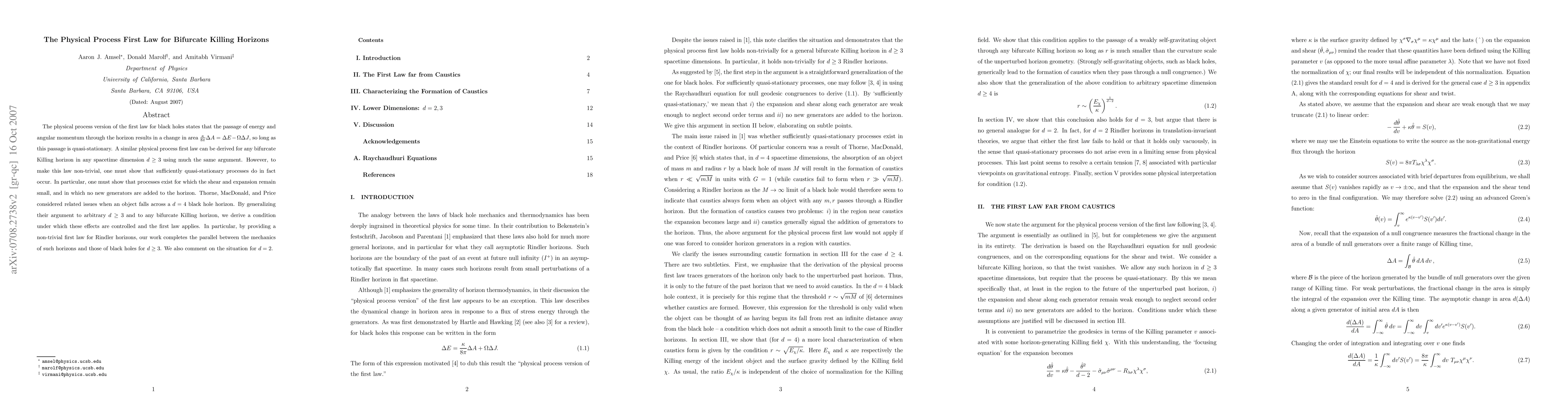 The research generalizes the argument of Thorne, MacDonald, and Price to arbitrary bifurcate Killing horizons in any spacetime dimension $d \ge 3$, using the physical process first law for black holes and demonstrating that sufficiently quasi-stationary processes occur without new generators or caustics forming.