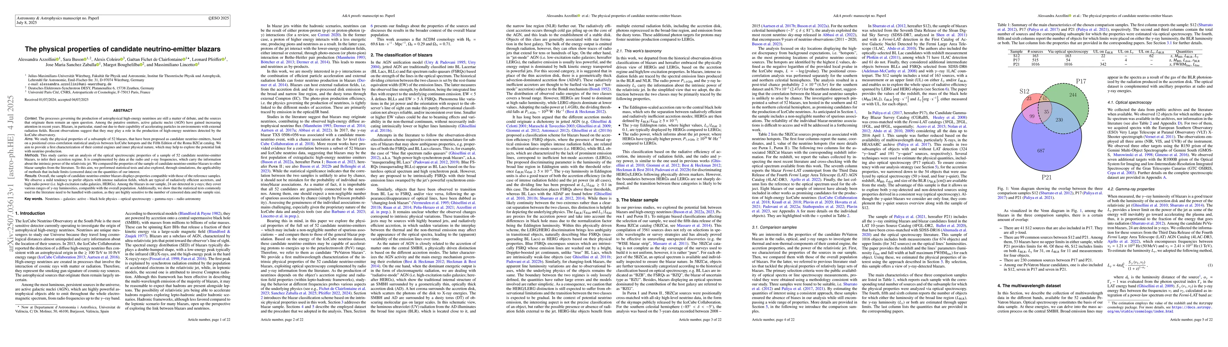 The study analyzes the physical properties of 52 candidate neutrino-emitter blazars, proposed as counterparts to IceCube hotspots, using a multiwavelength approach with data from optical, radio, and gamma-ray wavelengths. The research aims to infer the nature of these objects by pinpointing their HERG or LERG properties, focusing on mass accretion properties of the central engine and relativistic jet power.