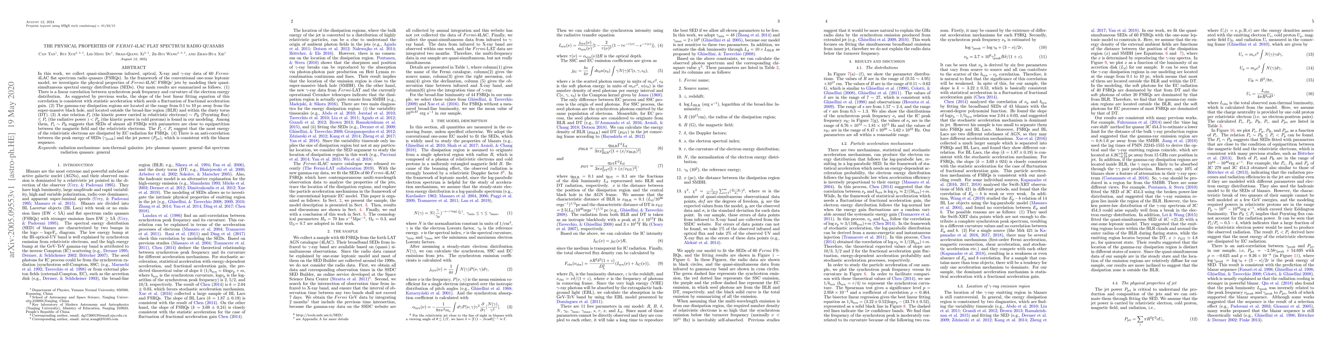 Researchers analyzed 60 flat spectrum radio quasars using multi-wavelength data to study the physical properties of their jets, finding a linear correlation between synchrotron peak frequency and electron energy distribution curvature.