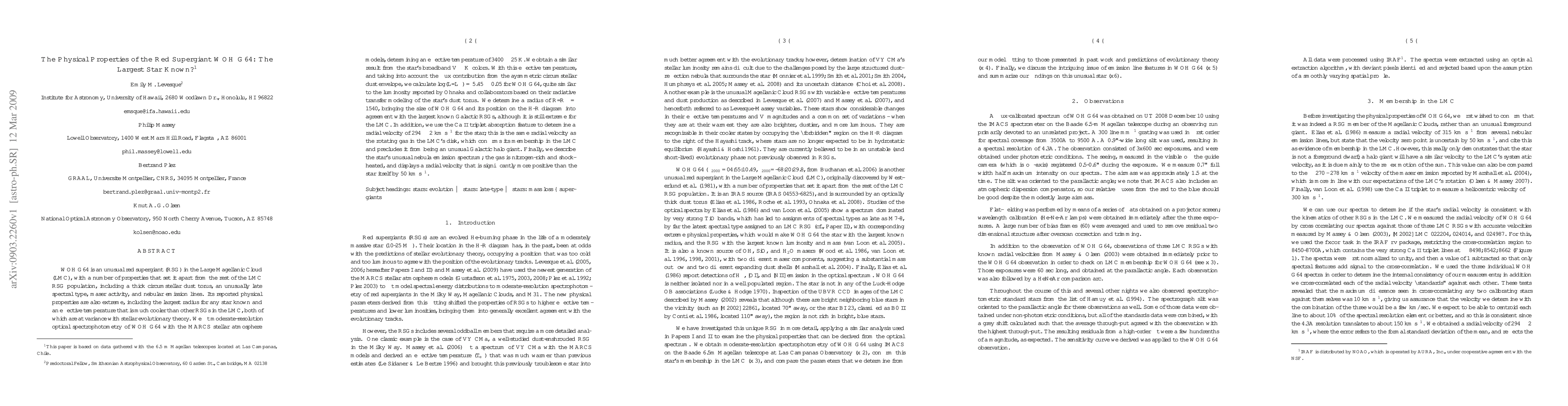 WOH G64, a red supergiant in the Large Magellanic Cloud, has an extreme radius of 1540 solar radii and an effective temperature of 3400 K, challenging stellar evolutionary models. Its circumstellar dust envelope and nebular emission lines further distinguish it from other stars in the LMC.