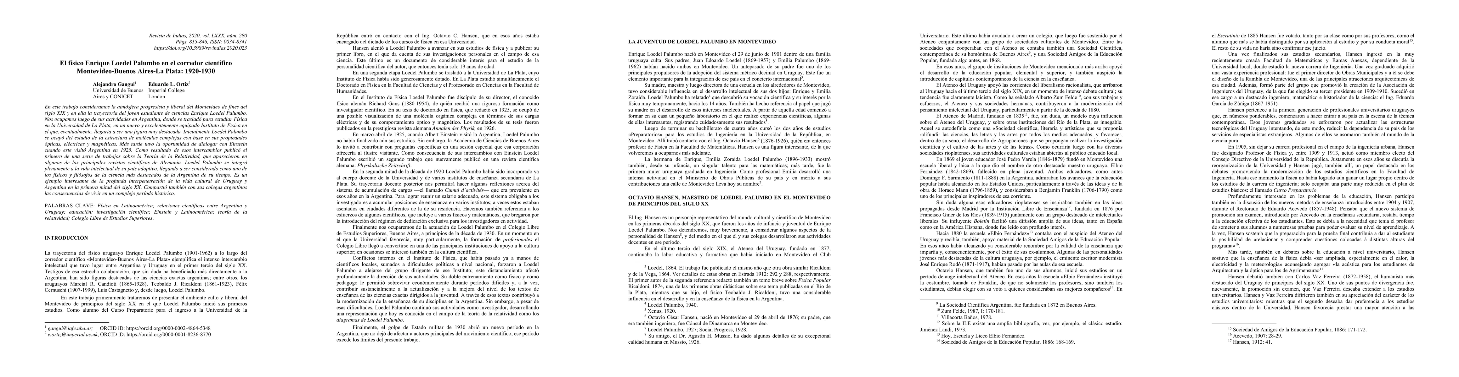 In this paper we consider Montevideo's liberal progressive atmosphere towards the end of the nineteenth century and, within it, the trajectory of young science student Enrique Loedel Palumbo. We discuss some of his activities in Argentina, where he moved to study Physics at a new and well-equipped Physics Institute at the National University of La Plata, where he would later become a leading figure. Initially Loedel Palumbo worked on the structure of complex molecules based on their magnetic, electric and optical properties. Later, when Einstein visited Argentina in 1925, he had chance to exchange ideas, which led to the publication of the first of a series of papers on the Theory of Relativity in some of Germany's leading scientific journals. Loedel Palumbo integrated fully with the intellectual life of his adopted country, becoming one of Argentina's top physicists and philosophers of science of his day. He is a valuable example of the deep intertwining of the intellectual life of Uruguay and Argentina in the first-half of the twentieth century. Like his Argentine colleagues, he also experienced the consequences of living through a complex historical period.