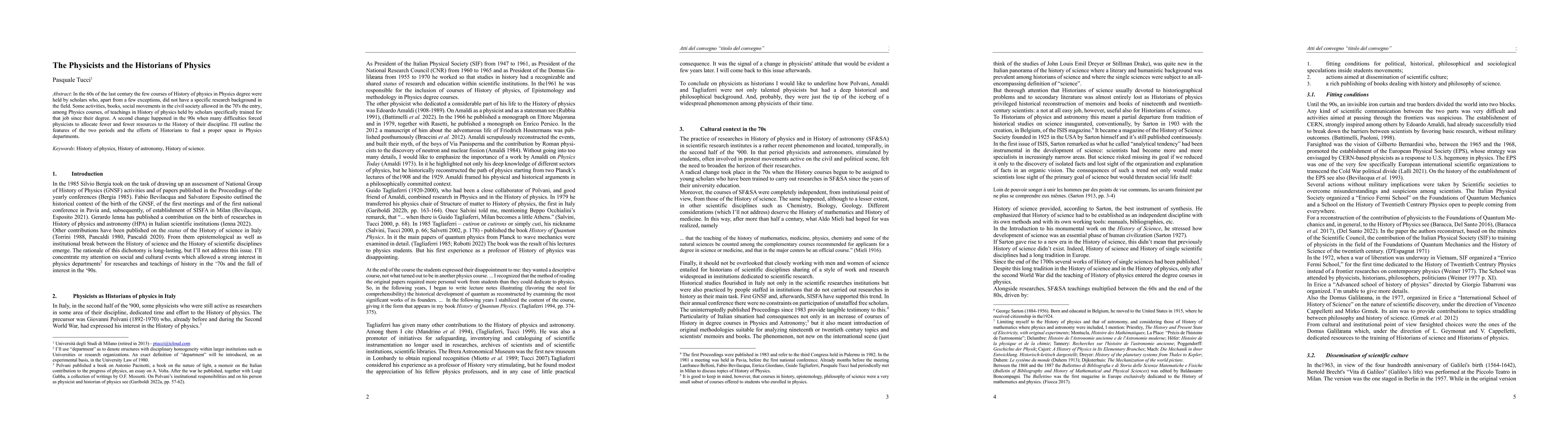 In the 60s of the last century the few courses of History of physics in Physics degree were held by scholars who, apart from a few exceptions, did not have a specific research background in the field. Some activities, books, social movements in the civil society allowed in the 70's the entry, among Physics courses, of teachings in History of physics held by scholars specifically trained for that job since their degree. A second change happened in the 90s when many difficulties forced physicists to allocate fewer and fewer resources to the History of their discipline. I'll outline the features of the two periods and the efforts of Historians to find a proper space in Physics departments.