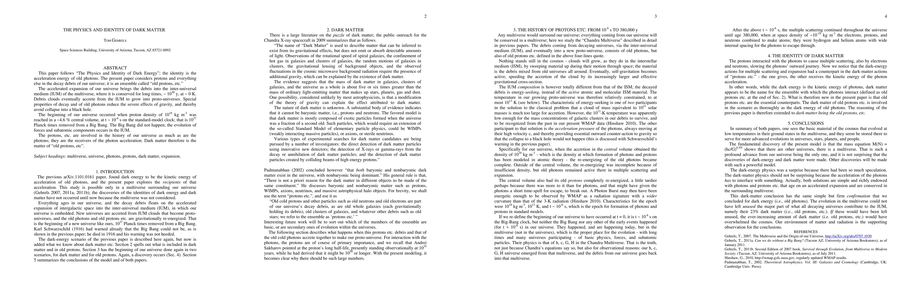This paper follows "The physics and identity of Dark Energy", which is the acceleration energy of old photons. The present paper considers everything else in the decay of our universe; it is an ensemble called "old protons, etc."; the ensemble will be listed. The accelerated expansion of our universe brings the decay debris into the inter-universal medium (IUM) of the multiverse, where it is conserved during long times. Debris clouds eventually accrete from the IUM and grow into proto-universes. The protons, etc. are involved as much as are the photons; they are the receivers of the kinetic energy of photon acceleration. Dark matter is therefore the matter of "old protons,etc." mentioned before.