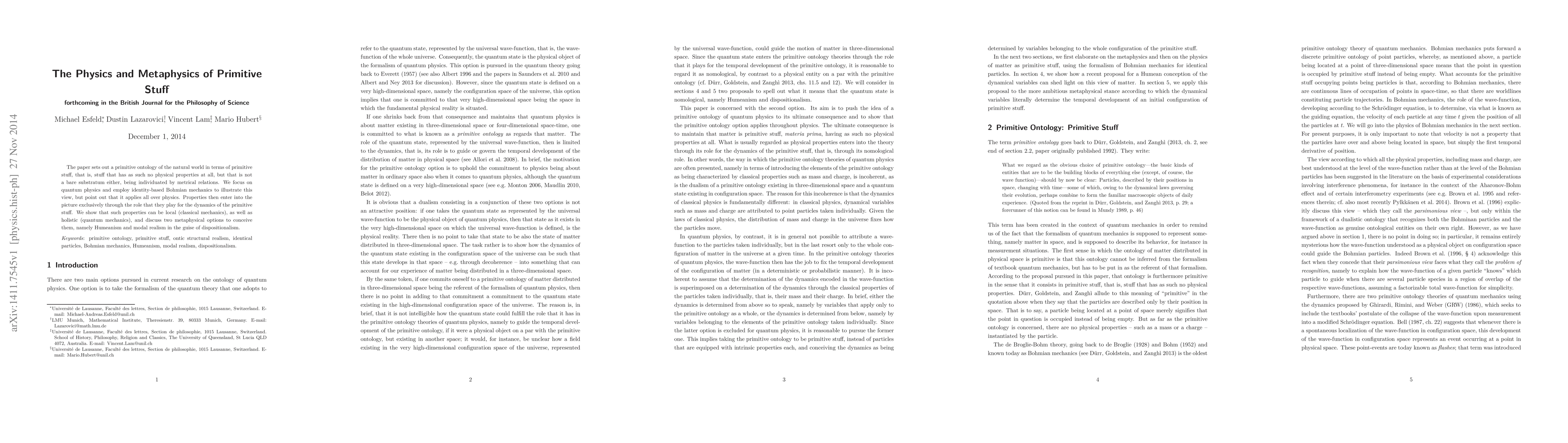 The paper sets out a primitive ontology of the natural world in terms of primitive stuff, that is, stuff that has as such no physical properties at all, but that is not a bare substratum either, being individuated by metrical relations. We focus on quantum physics and employ identity-based Bohmian mechanics to illustrate this view, but point out that it applies all over physics. Properties then enter into the picture exclusively through the role that they play for the dynamics of the primitive stuff. We show that such properties can be local (classical mechanics), as well as holistic (quantum mechanics), and discuss two metaphysical options to conceive them, namely Humeanism and modal realism in the guise of dispositionalism.