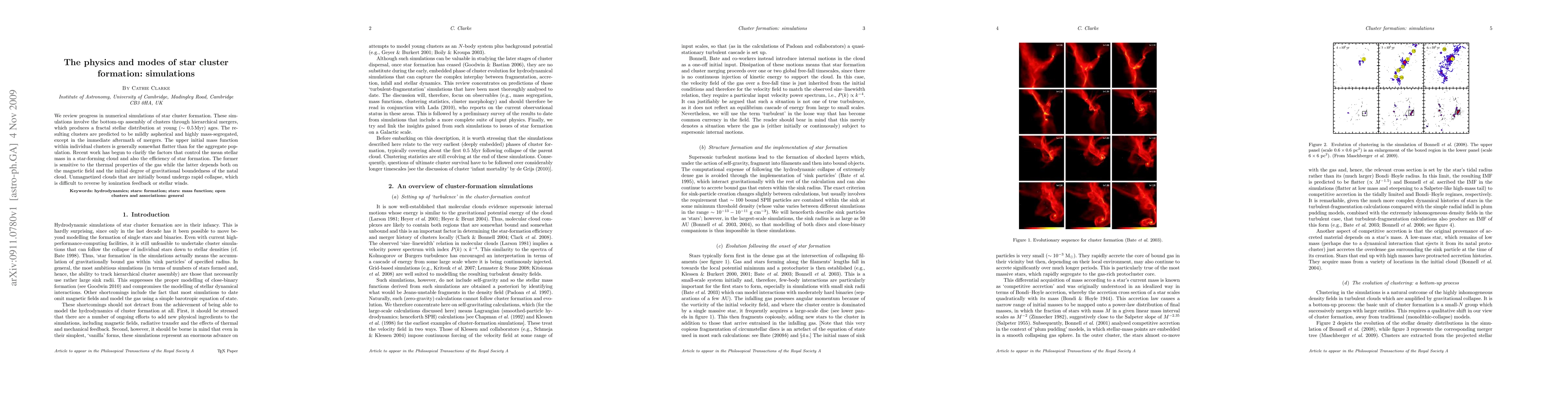 We review progress in numerical simulations of star cluster formation. These simulations involve the bottom-up assembly of clusters through hierarchical mergers, which produces a fractal stellar distribution at young (~0.5 Myr) ages. The resulting clusters are predicted to be mildly aspherical and highly mass-segregated, except in the immediate aftermath of mergers. The upper initial mass function within individual clusters is generally somewhat flatter than for the aggregate population. Recent work has begun to clarify the factors that control the mean stellar mass in a star-forming cloud and also the efficiency of star formation. The former is sensitive to the thermal properties of the gas while the latter depends both on the magnetic field and the initial degree of gravitational boundedness of the natal cloud. Unmagnetized clouds that are initially bound undergo rapid collapse, which is difficult to reverse by ionization feedback or stellar winds.