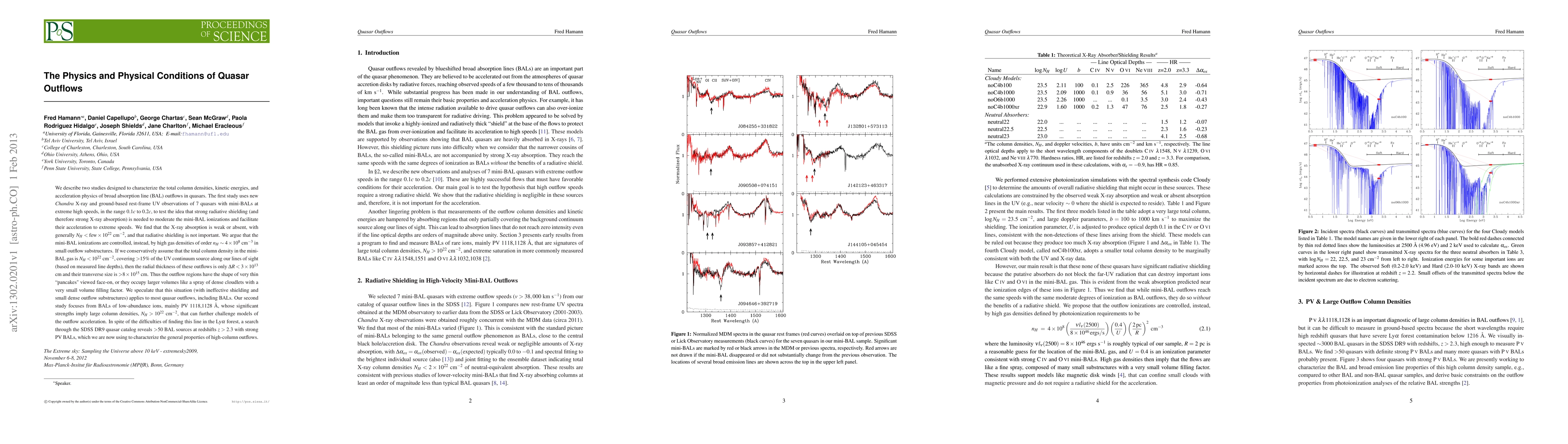 This paper investigates the physics and properties of quasar outflows, particularly broad absorption line (BAL) outflows. The first study finds weak X-ray absorption and suggests that mini-BAL ionizations are driven by high gas densities rather than radiative shielding, leading to thin outflow structures. The second study identifies BALs of low-abundance ions, indicating large column densities and challenging outflow acceleration models.