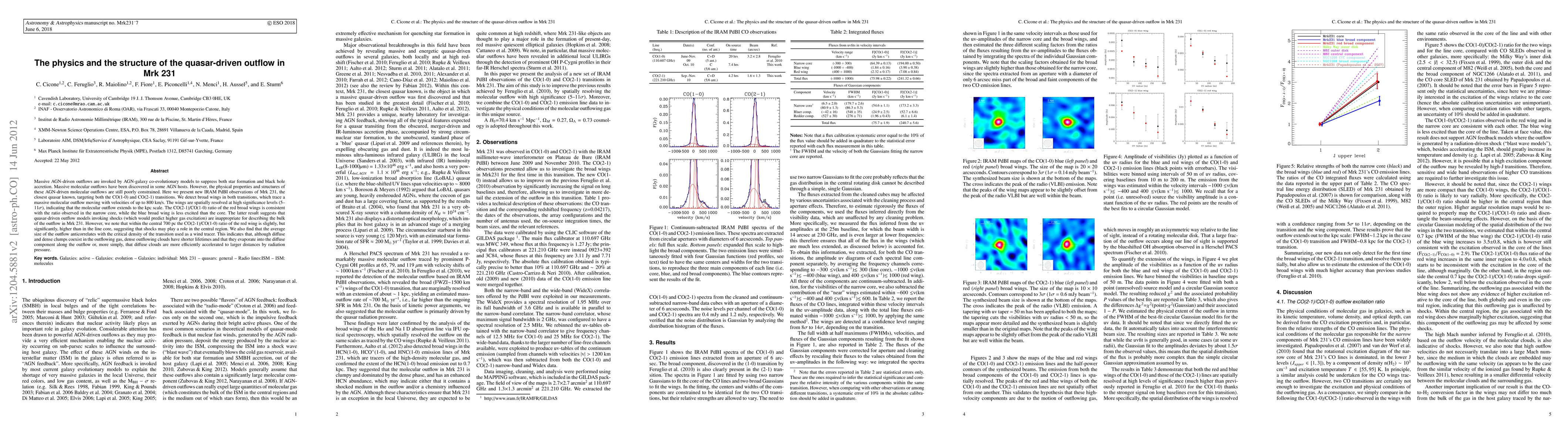 Massive AGN-driven outflows are invoked by AGN-galaxy co-evolutionary models to suppress both star formation and black hole accretion. Massive molecular outflows have recently been revealed in some AGN hosts. However, the physical properties and structure of these AGN-driven molecular outflows are still poorly constrained. Here we present new IRAM PdBI observations of Mrk231, the closest quasar known, targeting both the CO(1-0) and CO(2-1) transitions. We detect broad wings in both transitions, tracing a massive molecular outflow with velocities up to 800 km/s. The wings are spatially resolved at high significance level (5-11 sigma), indicating that the molecular outflow extends on the kpc scale. The CO(2-1)/CO(1-0) ratio of the red broad wings is consistent with the ratio observed in the narrow core, while the blue broad wing is less excited than the core. The latter result suggests that quasar driven outflow models invoking shocks (which would predict higher gas excitation) are not appropriate to describe the bulk of the outflow in Mrk231. However, we note that within the central 700 pc the CO(2-1)/CO(1-0) ratio of the red wing is slightly, but significantly, higher than in the line core, suggesting that shocks may play a role in the central region. We also find that the average size of the outflow anticorrelates with the critical density of the transition used as a wind tracer. This indicates that, although diffuse and dense clumps coexist in the outflowing gas, dense outflowing clouds have shorter lifetime and that they evaporate into the diffuse component along the outflow or, more simply, that diffuse clouds are more efficiently accelerated to larger distances by radiation pressure.