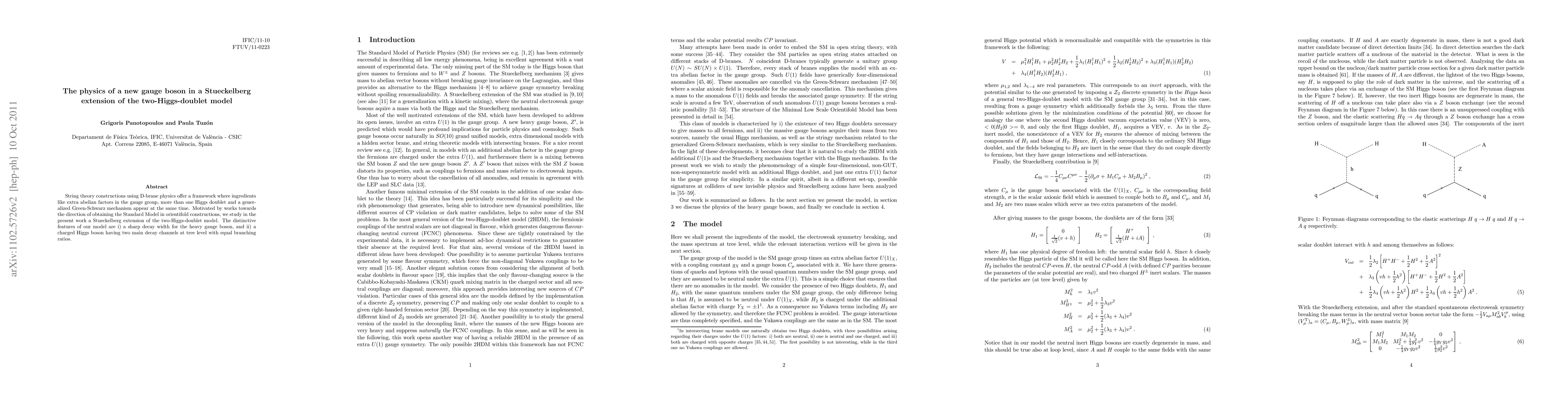 This paper explores a Stueckelberg extension of the two-Higgs-doublet model, motivated by string theory constructions, featuring a new gauge boson with a sharp decay width and a charged Higgs boson with two primary decay channels of equal branching ratios.