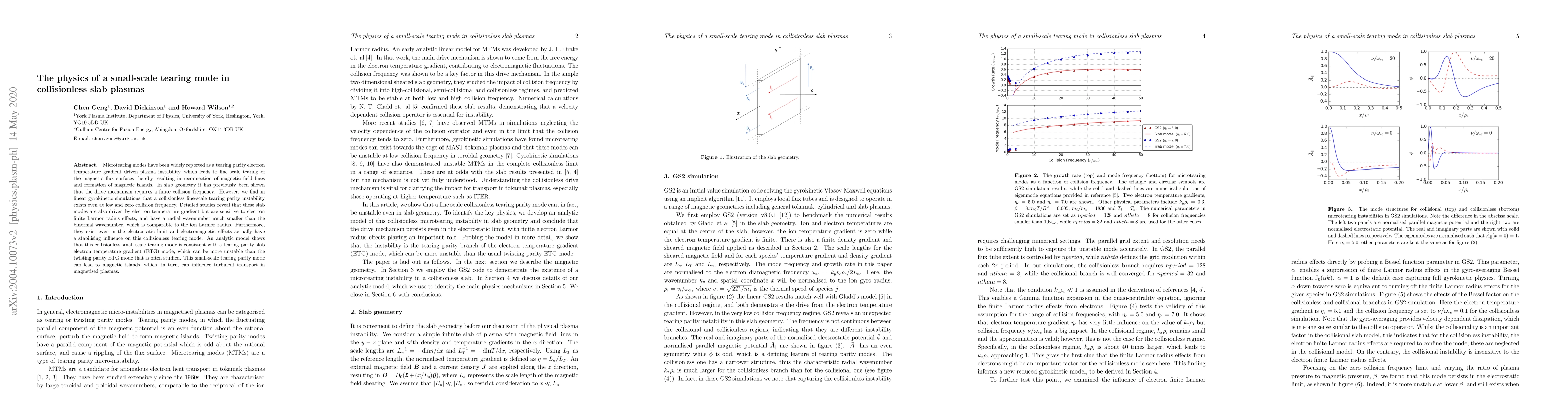 Microtearing modes have been widely reported as a tearing parity electron temperature gradient driven plasma instability, which leads to fine scale tearing of the magnetic flux surfaces thereby resulting in reconnection of magnetic field lines and formation of magnetic islands. In slab geometry it has previously been shown that the drive mechanism requires a finite collision frequency. However, we find in linear gyrokinetic simulations that a collisionless fine-scale tearing parity instability exists even at low and zero collision frequency. Detailed studies reveal that these slab modes are also driven by electron temperature gradient but are sensitive to electron finite Larmor radius effects, and have a radial wavenumber much smaller than the binormal wavenumber, which is comparable to the ion Larmor radius. Furthermore, they exist even in the electrostatic limit and electromagnetic effects actually have a stabilising influence on this collisionless tearing mode. An analytic model shows that this collisionless small scale tearing mode is consistent with a tearing parity slab electron temperature gradient (ETG) mode, which can be more unstable than the twisting parity ETG mode that is often studied. This small-scale tearing parity mode can lead to magnetic islands, which, in turn, can influence turbulent transport in magnetised plasmas.
