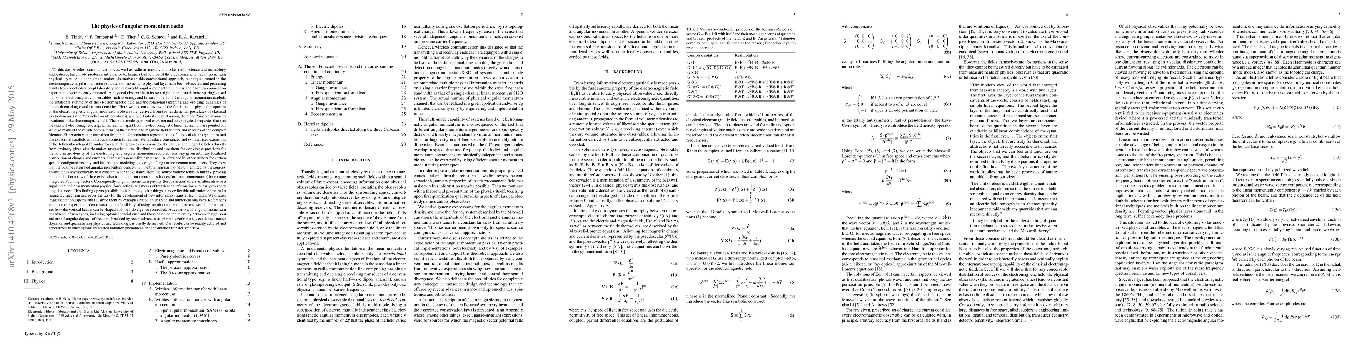 Wireless communications, radio astronomy and other radio science applications are predominantly implemented with techniques built on top of the electromagnetic linear momentum (Poynting vector) physical layer. As a supplement and/or alternative to this conventional approach, techniques rooted in the electromagnetic angular momentum physical layer have been advocated, and promising results from proof-of-concept radio communication experiments using angular momentum were recently published. This sparingly exploited physical observable describes the rotational (spinning and orbiting) physical properties of the electromagnetic fields and the rotational dynamics of the pertinent charge and current densities. In order to facilitate the exploitation of angular momentum techniques in real-world implementations, we present a systematic, comprehensive theoretical review of the fundamental physical properties of electromagnetic angular momentum observable. Starting from an overview that puts it into its physical context among the other Poincar\'e invariants of the electromagnetic field, we describe the multi-mode quantized character and other physical properties that sets electromagnetic angular momentum apart from the electromagnetic linear momentum. These properties allow, among other things, a more flexible and efficient utilization of the radio frequency spectrum. Implementation aspects are discussed and illustrated by examples based on analytic and numerical solutions.