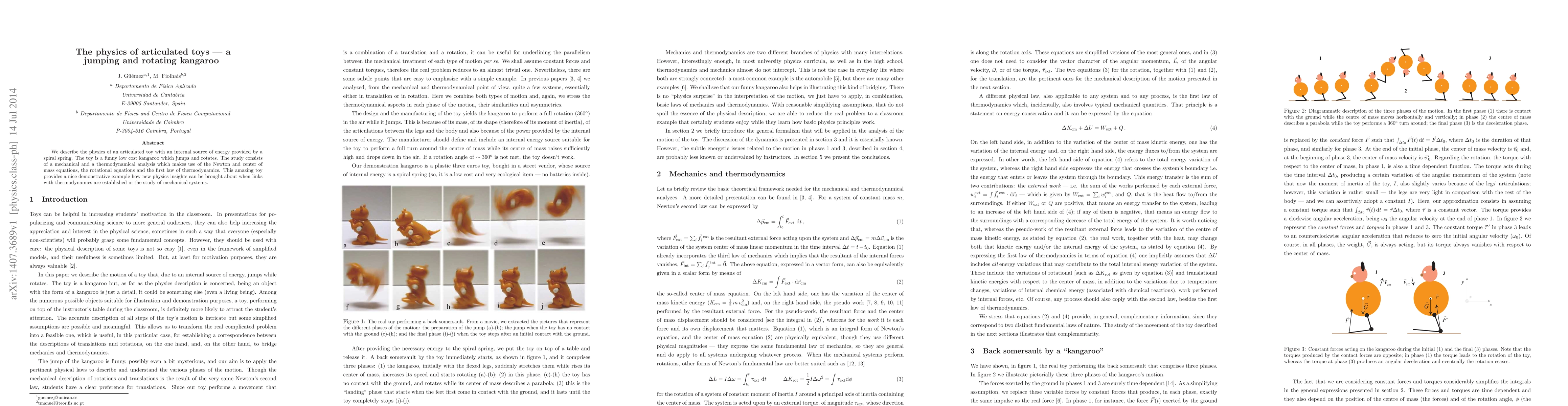 We describe the physics of an articulated toy with an internal source of energy provided by a spiral spring. The toy is a funny low cost kangaroo which jumps and rotates. The study consists of a mechanical and a thermodynamical analysis which makes use of the Newton and center of mass equations, the rotational equations and the first law of thermodynamics. This amazing toy provides a nice demonstrative example how new physics insights can be brought about when links with thermodynamics are established in the study of mechanical systems.
