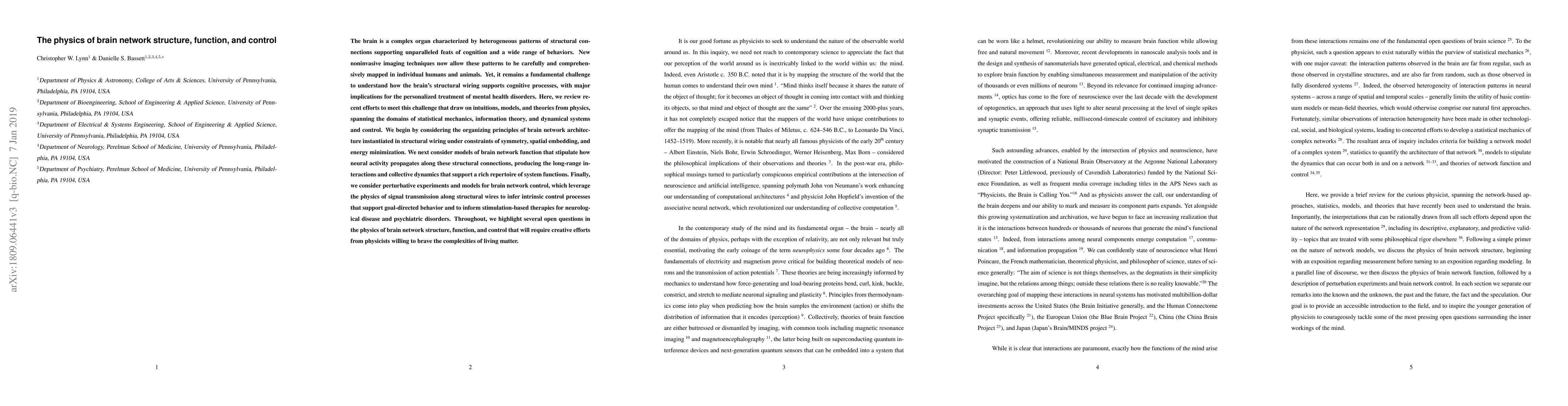 The brain is a complex organ characterized by heterogeneous patterns of structural connections supporting unparalleled feats of cognition and a wide range of behaviors. New noninvasive imaging techniques now allow these patterns to be carefully and comprehensively mapped in individual humans and animals. Yet, it remains a fundamental challenge to understand how the brain's structural wiring supports cognitive processes, with major implications for the personalized treatment of mental health disorders. Here, we review recent efforts to meet this challenge that draw on intuitions, models, and theories from physics, spanning the domains of statistical mechanics, information theory, and dynamical systems and control. We begin by considering the organizing principles of brain network architecture instantiated in structural wiring under constraints of symmetry, spatial embedding, and energy minimization. We next consider models of brain network function that stipulate how neural activity propagates along these structural connections, producing the long-range interactions and collective dynamics that support a rich repertoire of system functions. Finally, we consider perturbative experiments and models for brain network control, which leverage the physics of signal transmission along structural wires to infer intrinsic control processes that support goal-directed behavior and to inform stimulation-based therapies for neurological disease and psychiatric disorders. Throughout, we highlight several open questions in the physics of brain network structure, function, and control that will require creative efforts from physicists willing to brave the complexities of living matter.