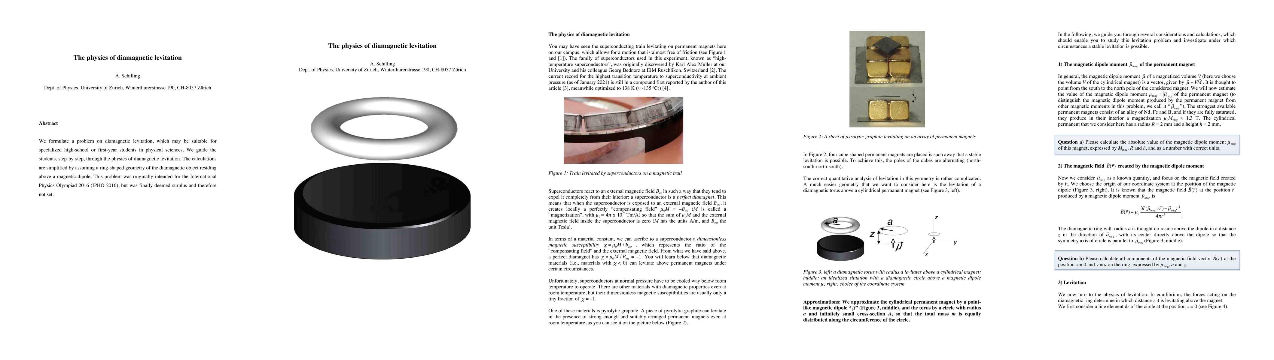 This paper provides a step-by-step guide on the physics of diamagnetic levitation, suitable for high-school or first-year students, using simplified calculations for a ring-shaped diamagnetic object above a magnetic dipole. Originally intended for the 2016 International Physics Olympiad, it was ultimately not used.