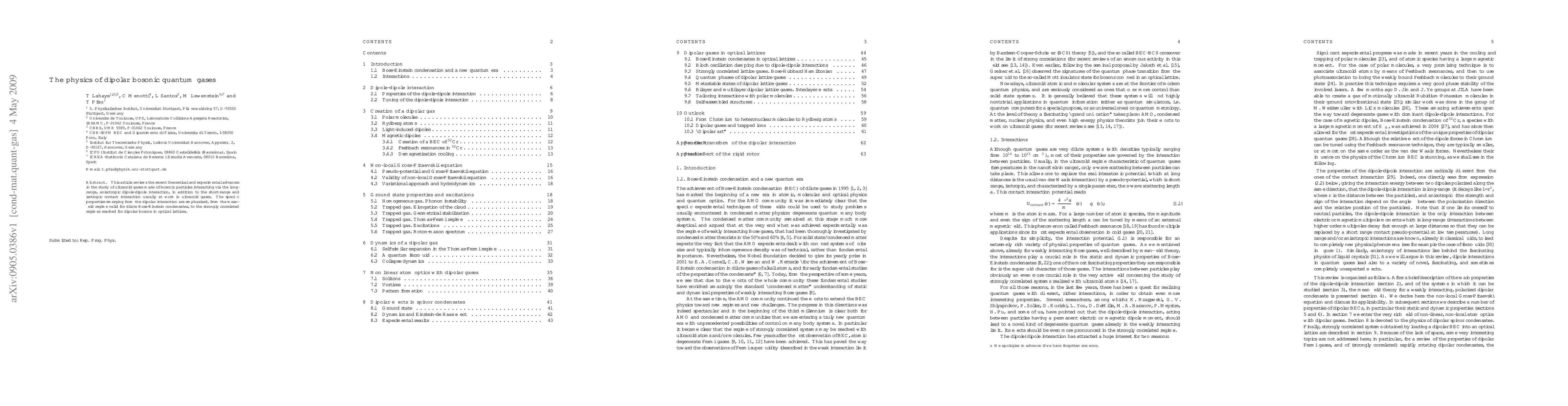 This article reviews the recent theoretical and experimental advances in the study of ultracold gases made of bosonic particles interacting via the long-range, anisotropic dipole-dipole interaction, in addition to the short-range and isotropic contact interaction usually at work in ultracold gases. The specific properties emerging from the dipolar interaction are emphasized, from the mean-field regime valid for dilute Bose-Einstein condensates, to the strongly correlated regimes reached for dipolar bosons in optical lattices.