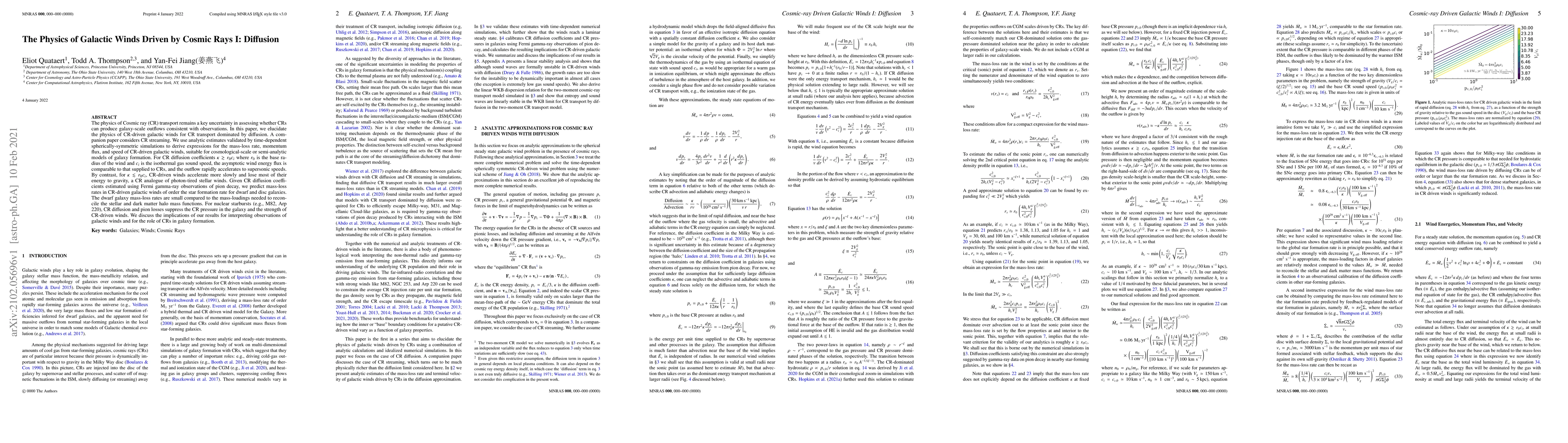 This paper investigates the physics of cosmic ray (CR)-driven galactic winds where CR transport is primarily via diffusion. It finds that for high diffusion coefficients, winds accelerate rapidly to supersonic speeds, while lower coefficients result in slower acceleration and significant energy loss to gravity. The study predicts mass-loss rates in galactic winds that are comparable to star formation rates, with implications for galaxy formation and the interpretation of observational data.