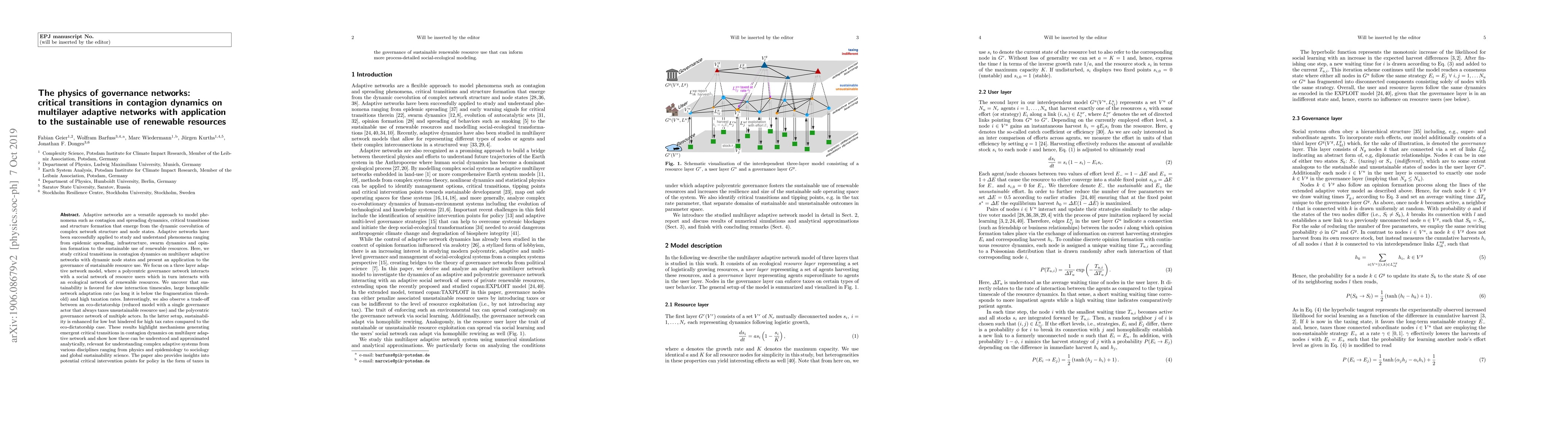 This paper investigates critical transitions in contagion dynamics on multilayer adaptive networks, focusing on a three-layer model for sustainable renewable resource governance. It finds that sustainability is favored by slow interaction timescales, high adaptation rates, and moderate taxation, while highlighting trade-offs between polycentric governance and eco-dictatorship approaches.