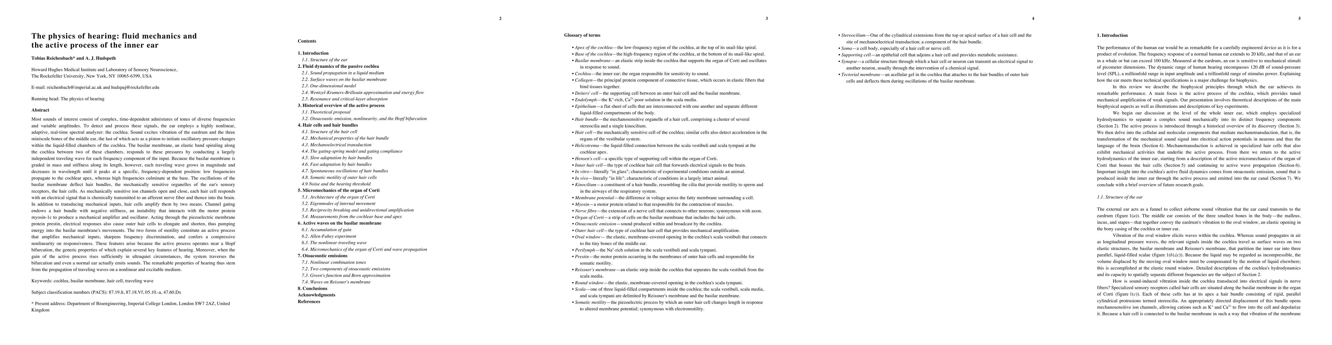 Most sounds of interest consist of complex, time-dependent admixtures of tones of diverse frequencies and variable amplitudes. To detect and process these signals, the ear employs a highly nonlinear, adaptive, real-time spectral analyzer: the cochlea. Sound excites vibration of the eardrum and the three miniscule bones of the middle ear, the last of which acts as a piston to initiate oscillatory pressure changes within the liquid-filled chambers of the cochlea. The basilar membrane, an elastic band spiraling along the cochlea between two of these chambers, responds to these pressures by conducting a largely independent traveling wave for each frequency component of the input. Because the basilar membrane is graded in mass and stiffness along its length, however, each traveling wave grows in magnitude and decreases in wavelength until it peaks at a specific, frequency-dependent position: low frequencies propagate to the cochlear apex, whereas high frequencies culminate at the base. The oscillations of the basilar membrane deflect hair bundles, the mechanically sensitive organelles of the ear's sensory receptors, the hair cells. As mechanically sensitive ion channels open and close, each hair cell responds with an electrical signal that is chemically transmitted to an afferent nerve fiber and thence into the brain. In addition to transducing mechanical inputs, hair cells amplify them [...]