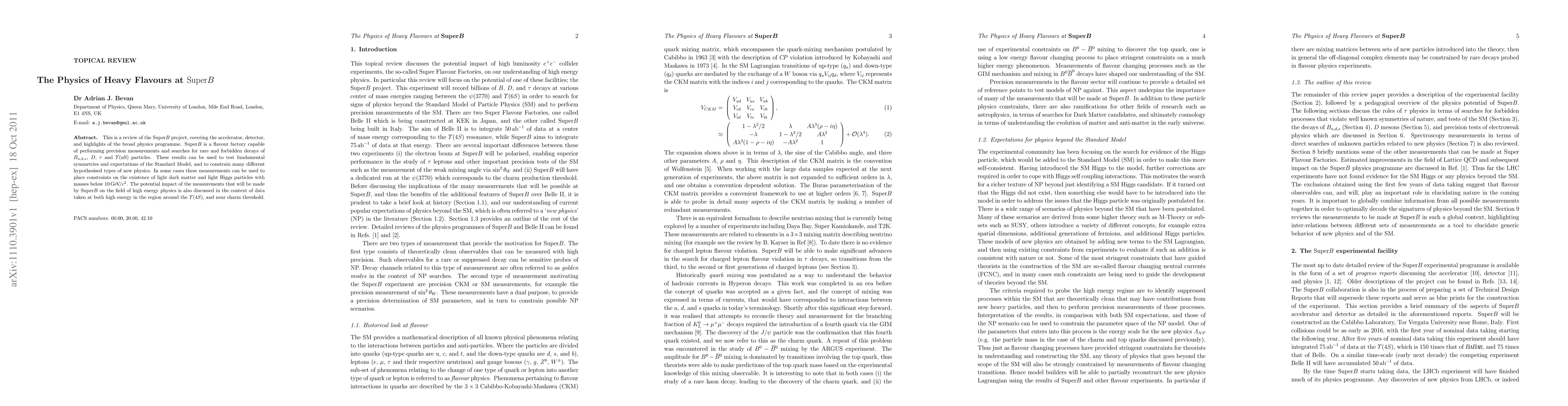 This review of the SuperB project outlines the accelerator, detector, and physics programme focused on precision measurements of heavy flavour particles. It aims to test Standard Model symmetries and explore new physics, potentially constraining light dark matter and Higgs particles.