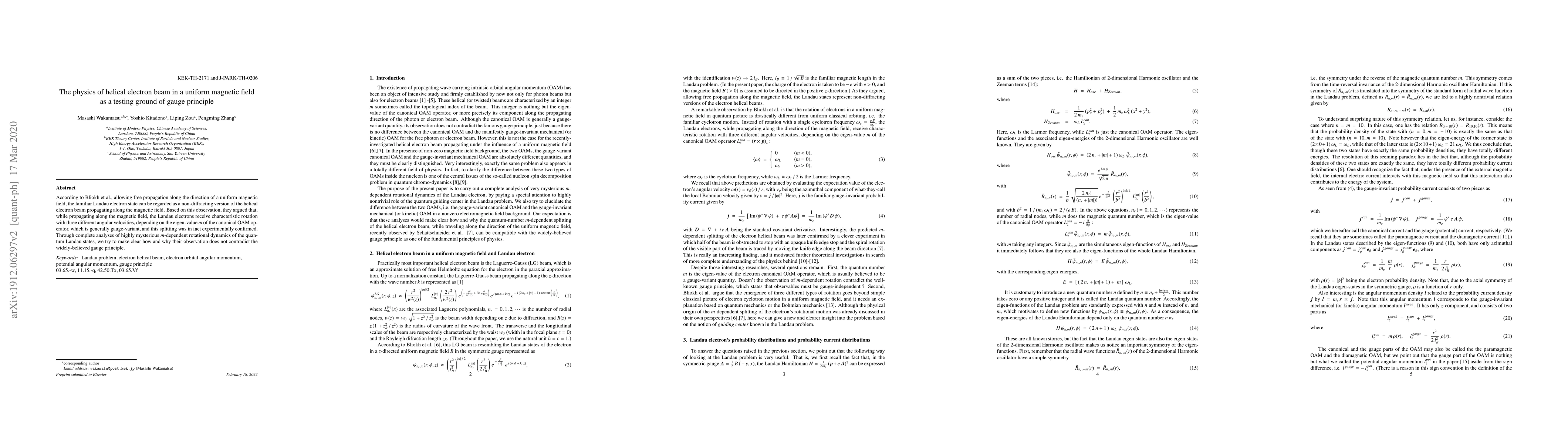 According to Bliokh et al., allowing free propagation along the direction of a uniform magnetic field, the familiar Landau electron state can be regarded as a non-diffracting version of the helical electron beam propagating along the magnetic field. Based on this observation, they argued that, while propagating along the magnetic field, the Landau electrons receive characteristic rotation with three different angular velocities, depending on the eigen-value $m$ of the canonical OAM operator, which is generally gauge-variant, and this splitting was in fact experimentally confirmed. Through complete analyses of highly mysterious $m$-dependent rotational dynamics of the quantum Landau states, we try to make clear how and why their observation does not contradict the widely-believed gauge principle.
