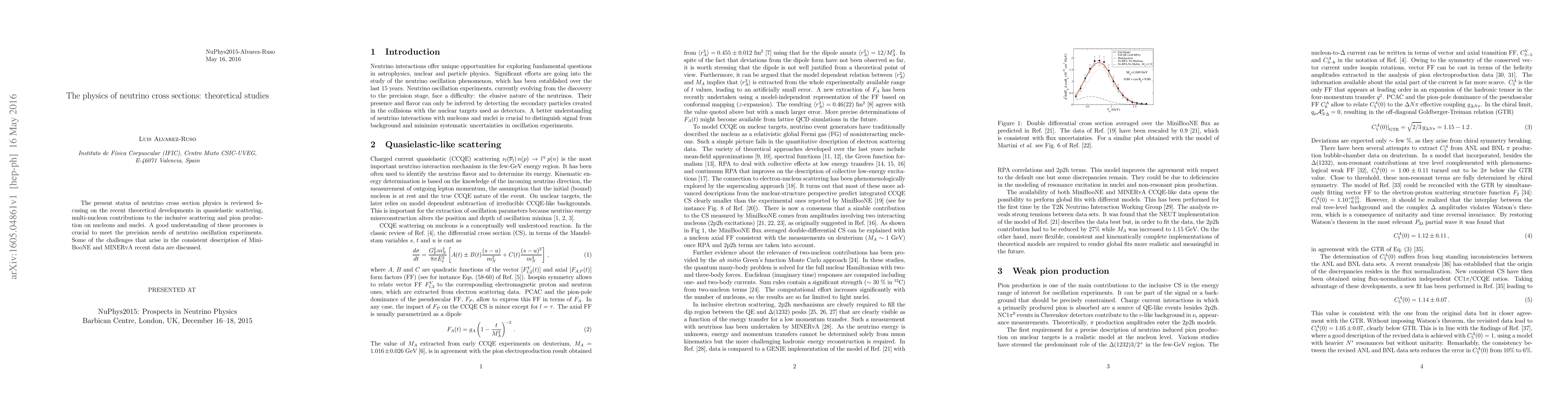The present status of neutrino cross section physics is reviewed focusing on the recent theoretical developments in quasielastic scattering, multi-nucleon contributions to the inclusive scattering and pion production on nucleons and nuclei. A good understanding of these processes is crucial to meet the precision needs of neutrino oscillation experiments. Some of the challenges that arise in the consistent description of MiniBooNE and MINERvA recent data are discussed.