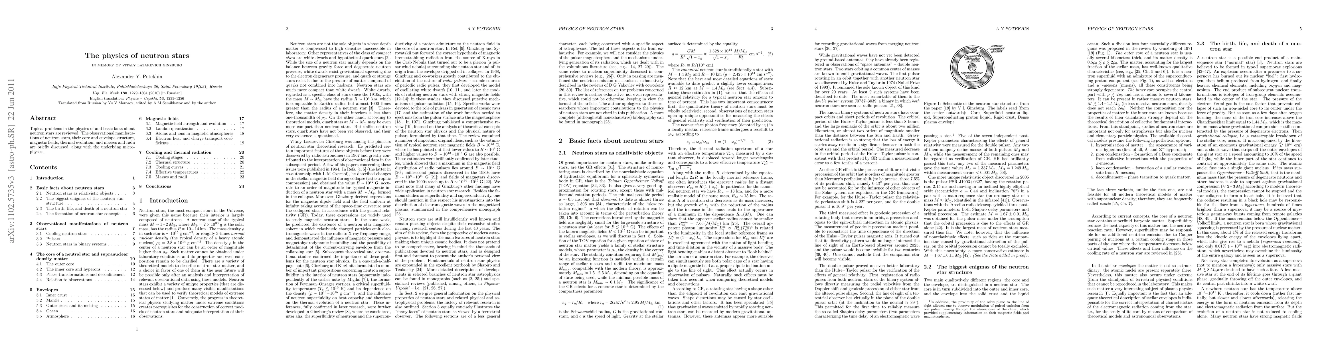Topical problems in the physics of and basic facts about neutron stars are reviewed. The observational manifestations of neutron stars, their core and envelope structure, magnetic fields, thermal evolution, and masses and radii are briefly discussed, along with the underlying microphysics.