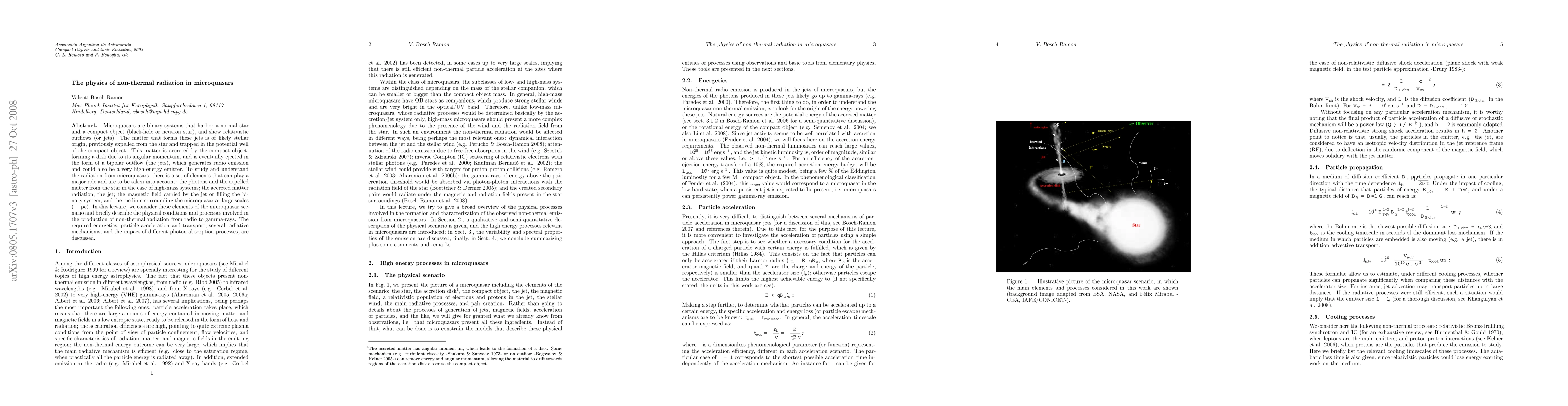Microquasars are binary systems that harbor a normal star and a compact object (black-hole or neutron star), and show relativistic outflows (or jets). The matter that forms these jets is of likely stellar origin, previously expelled from the star and trapped in the potential well of the compact object. This matter is accreted by the compact object, forming a disk due to its angular momentum, and is eventually ejected in the form of a bipolar outflow (the jets), which generates radio emission and could also be a very high-energy emitter. To study and understand the radiation from microquasars, there is a set of elements that can play a major role and are to be taken into account: the photons and the expelled matter from the star in the case of high-mass systems; the accreted matter radiation; the jet; the magnetic field carried by the jet or filling the binary system; and the medium surrounding the microquasar at large scales (~pc). In this lecture, we consider these elements of the microquasar scenario and briefly describe the physical conditions and processes involved in the production of non-thermal radiation from radio to gamma-rays. The required energetics, particle acceleration and transport, several radiative mechanisms, and the impact of different photon absorption processes, are discussed.