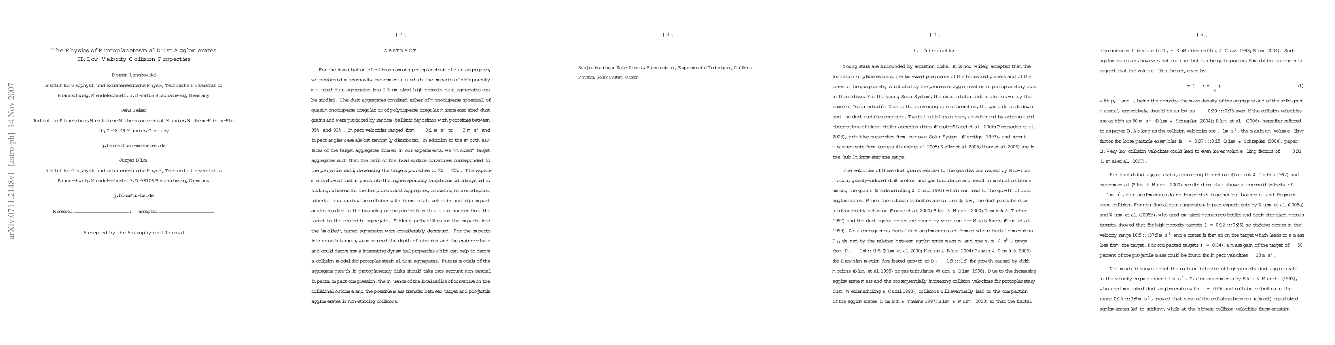 This paper investigates low-velocity collisions among protoplanetesimal dust aggregates using microgravity experiments. It finds that high-porosity targets almost always stick to projectiles, while less porous aggregates tend to bounce at intermediate velocities and high angles, transferring mass. Future models should consider non-central impacts, compression effects, local curvature influences, and mass transfer in non-sticking collisions.