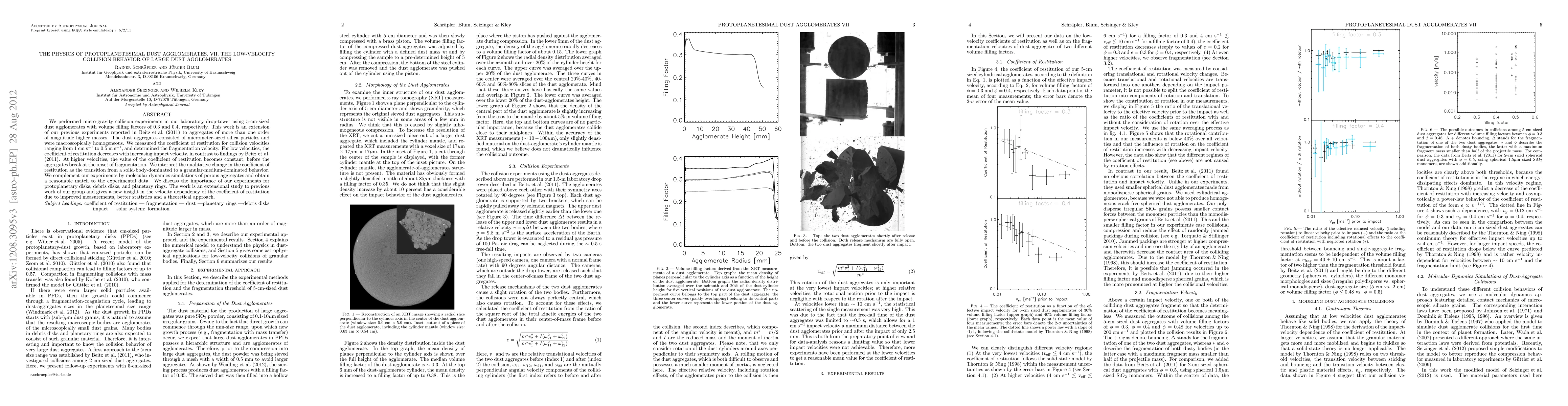 This study investigates the low-velocity collision behavior of large dust agglomerates using micro-gravity experiments and molecular dynamics simulations. The results show a transition in the coefficient of restitution from solid-body to granular-medium behavior, providing new insights into the dynamics of protoplanetary disks and planetary rings.