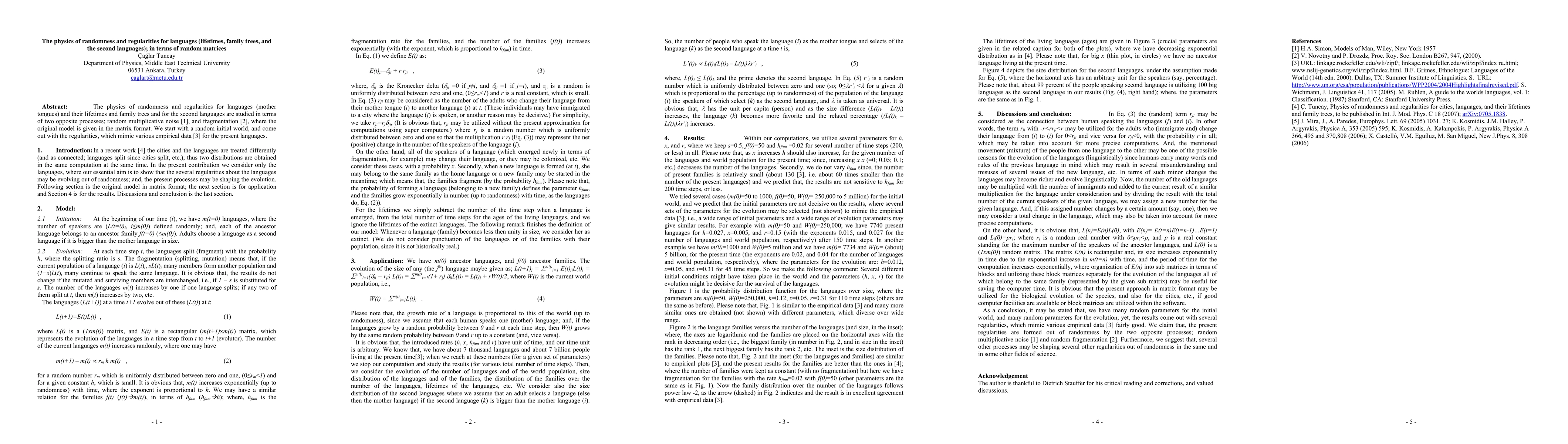 The physics of randomness and regularities for languages (mother tongues) and their lifetimes and family trees and for the second languages are studied in terms of two opposite processes; random multiplicative noise [1], and fragmentation [2], where the original model is given in the matrix format. We start with a random initial world, and come out with the regularities, which mimic various empirical data [3] for the present languages.