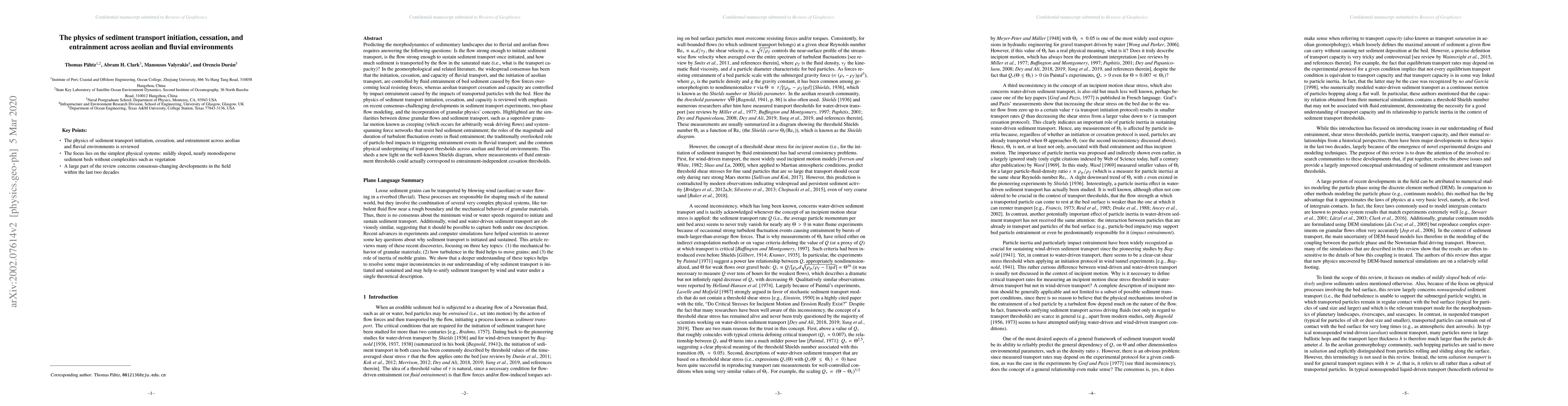 This paper reviews the physics of sediment transport initiation, cessation, and capacity in both aeolian and fluvial environments, emphasizing recent developments in experimental and modeling approaches. It highlights the role of granular physics, turbulent fluctuations, and particle-bed impacts in sediment transport processes, challenging traditional views on transport thresholds.