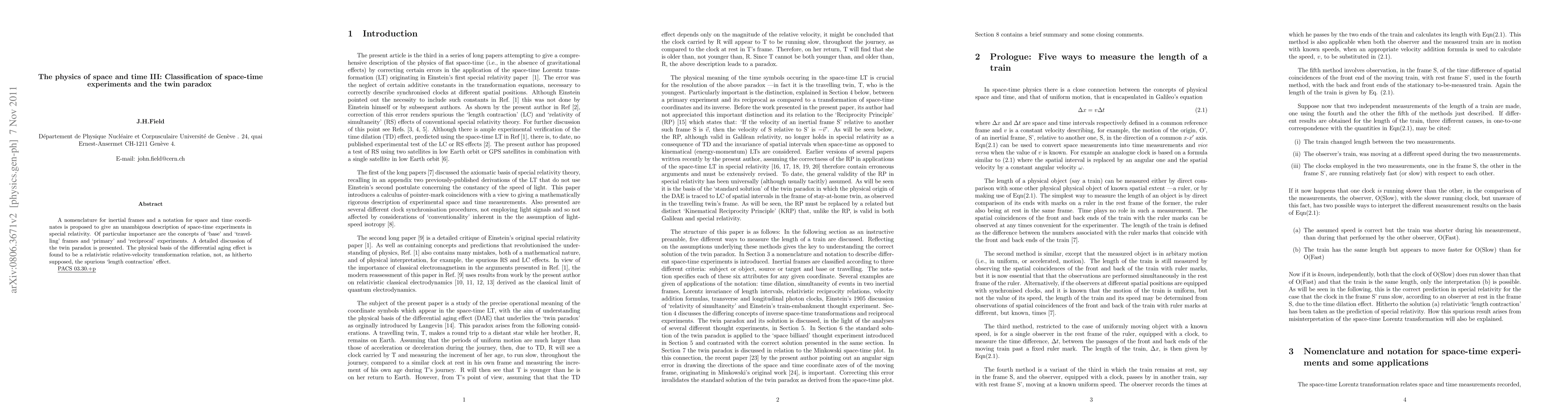 A nomenclature for inertial frames and a notation for space and time coordinates is proposed to give an unambigous description of space-time experiments in special relativity. Of particular importance are the concepts of `base' and `travelling' frames and `primary' and `reciprocal' experiments. A detailed discussion of the twin paradox is presented. The physical basis of the differential aging effect is found to be a relativistic relative-velocity transformation relation, not, as hitherto supposed, the spurious `length contraction' effect.