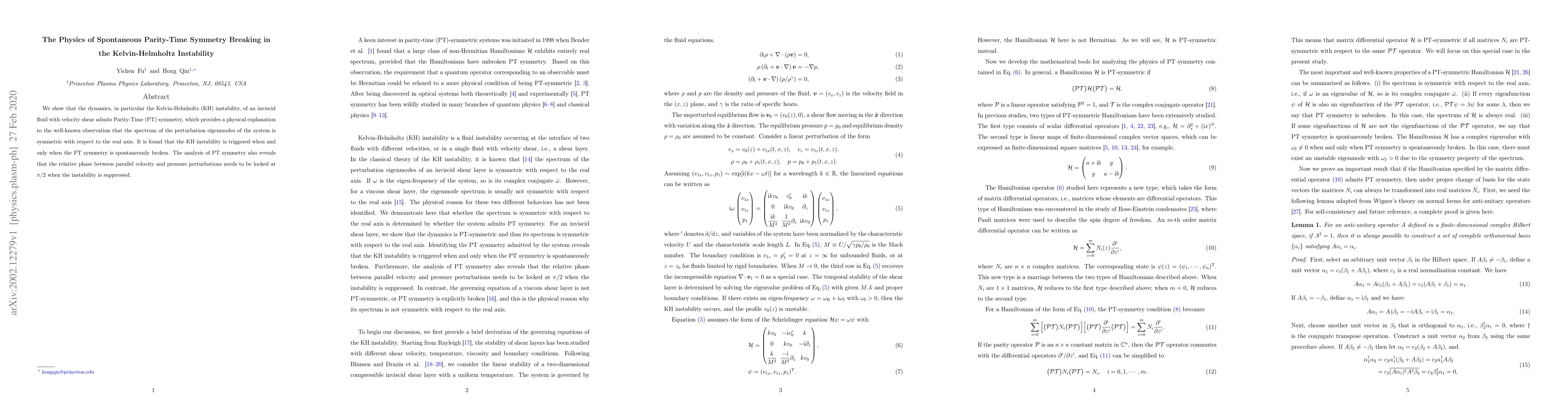 This paper demonstrates that the Kelvin-Helmholtz instability in an inviscid fluid with velocity shear exhibits Parity-Time (PT) symmetry, explaining the symmetric spectrum of perturbation eigenmodes. The study reveals that the instability occurs only when PT symmetry is spontaneously broken, and stability is maintained when the relative phase between velocity and pressure perturbations is locked at $\pi/2$.