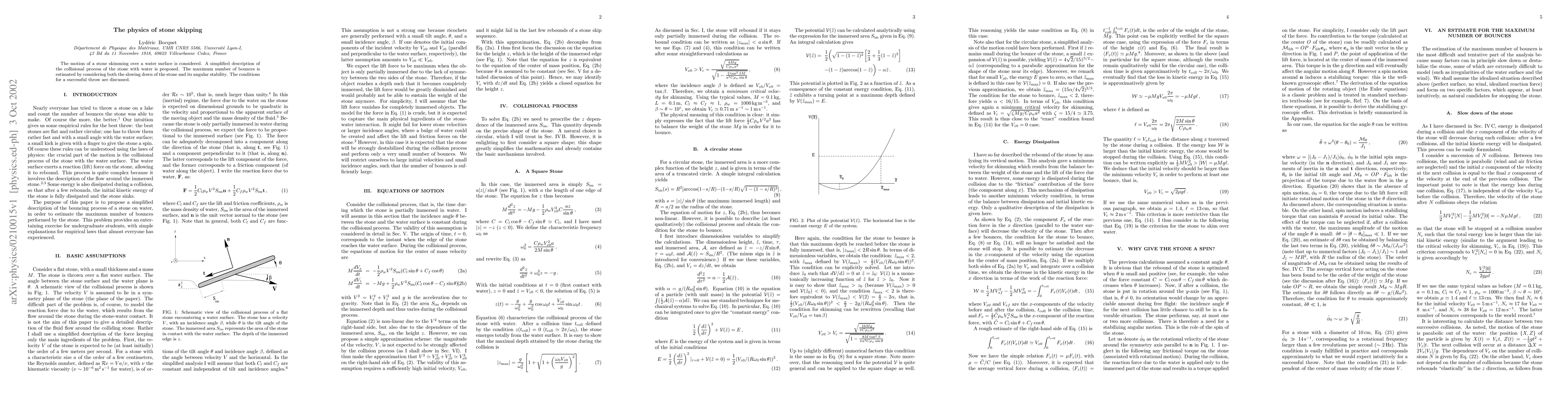 Researchers studied stone skipping on water surfaces, proposing a simplified collision model to estimate maximum bounces and successful throw conditions based on angular stability and slowing down of the stone.