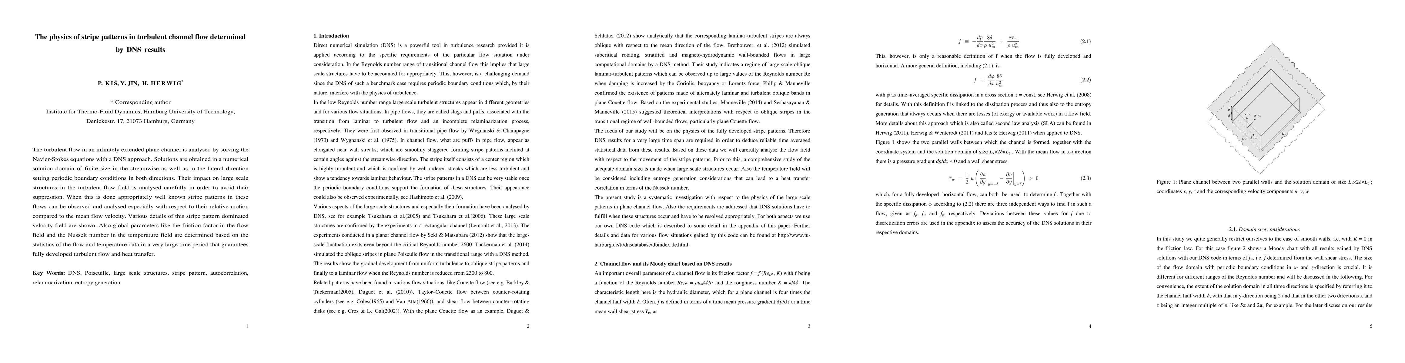 This paper uses DNS to analyze stripe patterns in turbulent channel flow, focusing on their relative motion and the impact of boundary conditions. It determines global parameters like the friction factor and Nusselt number based on extensive statistical analysis of flow and temperature data.