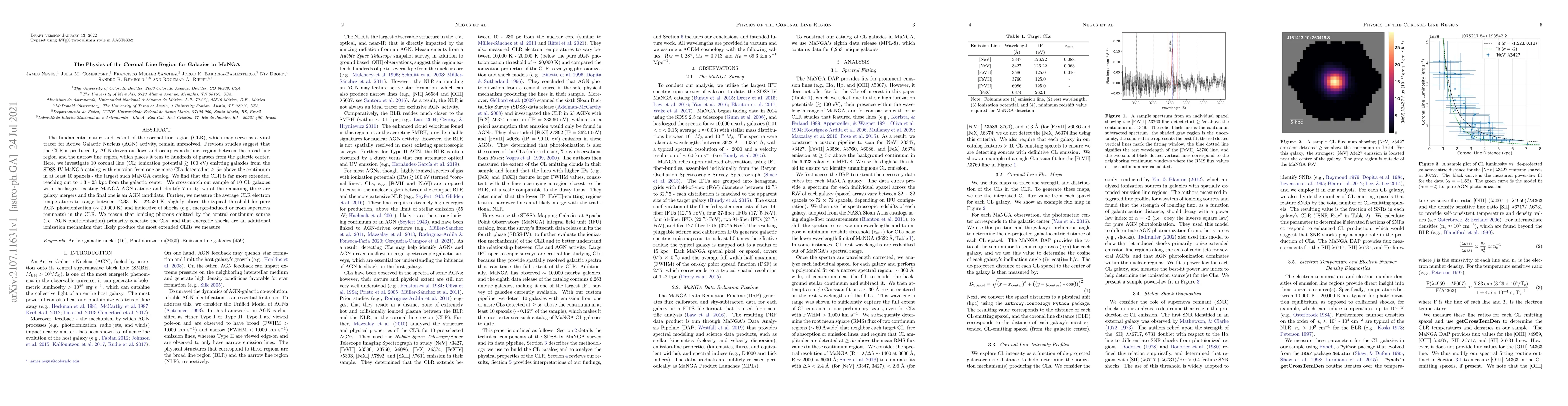 This study investigates the coronal line region (CLR) in 10 galaxies from the MaNGA catalog, finding it extends up to 23 kpc from the galactic center. The CLR is likely generated by AGN photoionization and energetic shocks, with electron temperatures ranging from 12,331 K to 22,530 K.