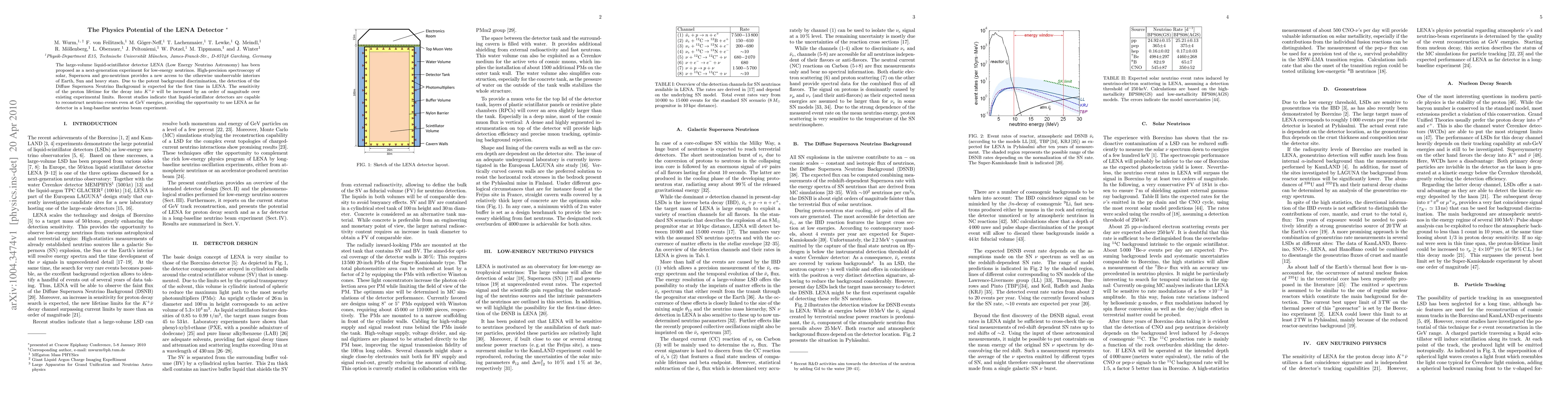 The LENA detector, a large-volume liquid-scintillator setup, aims to achieve high-precision spectroscopy of solar, supernova, and geo-neutrinos, enabling unprecedented insights into the interiors of celestial bodies. It is expected to detect the Diffuse Supernova Neutrino Background and significantly enhance the sensitivity for proton decay into kaon and antineutrino.