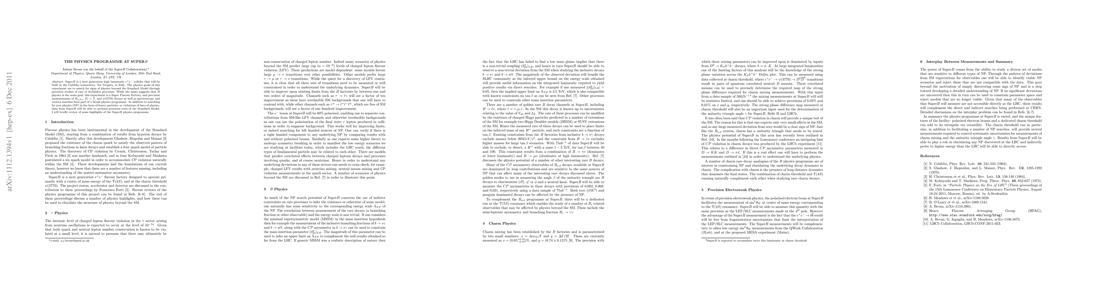 SuperB is a high luminosity $e^+e^-$ collider aiming to explore physics beyond the Standard Model through precision studies of rare processes. Its broad physics programme includes detailed measurements of $B$, $D$, $\tau$, $\Upsilon$, and $\psi(3770)$ decays, alongside searches for new particles and precision tests of the Standard Model.