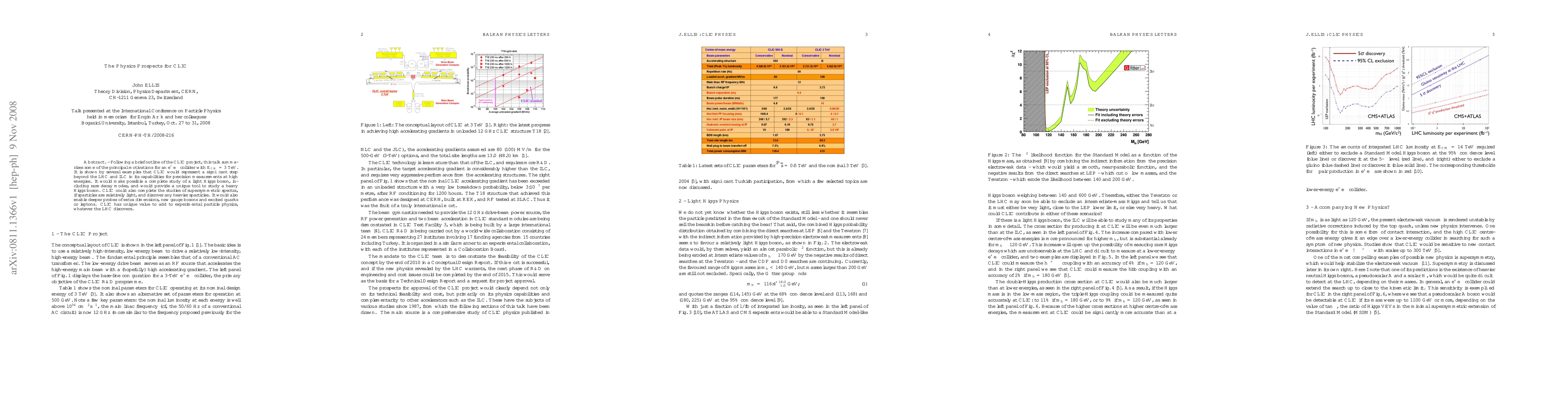 The research discusses the physics prospects of a proposed e+ e- collider, CLIC, with a center-of-mass energy of 3 TeV, comparing its capabilities to those of the LHC and ILC.