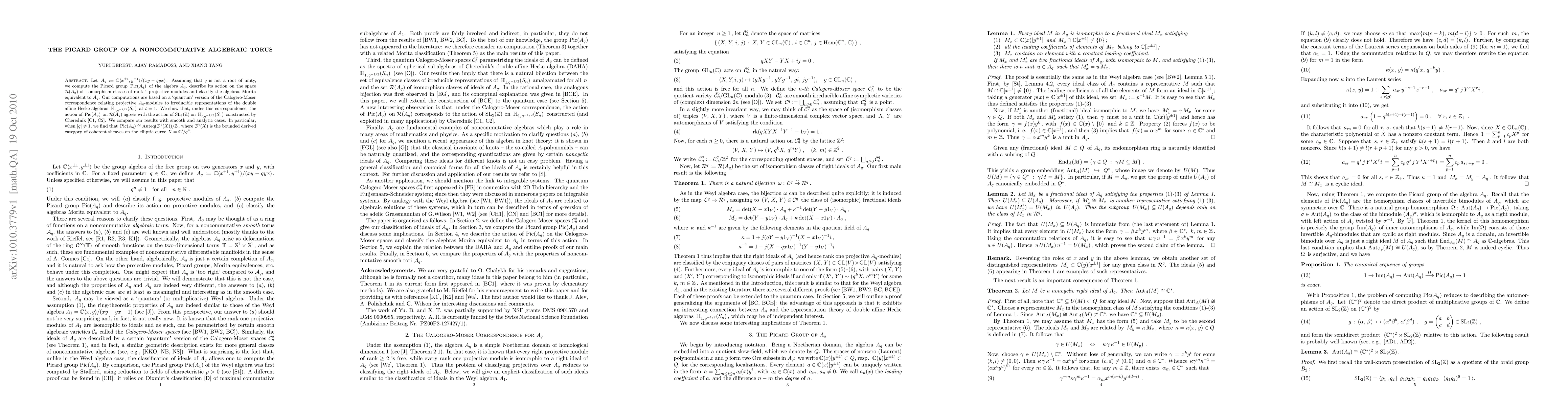 The paper computes the Picard group of a noncommutative algebraic torus and finds it isomorphic to the group of auto-equivalences of the bounded derived category of coherent sheaves on an elliptic curve.