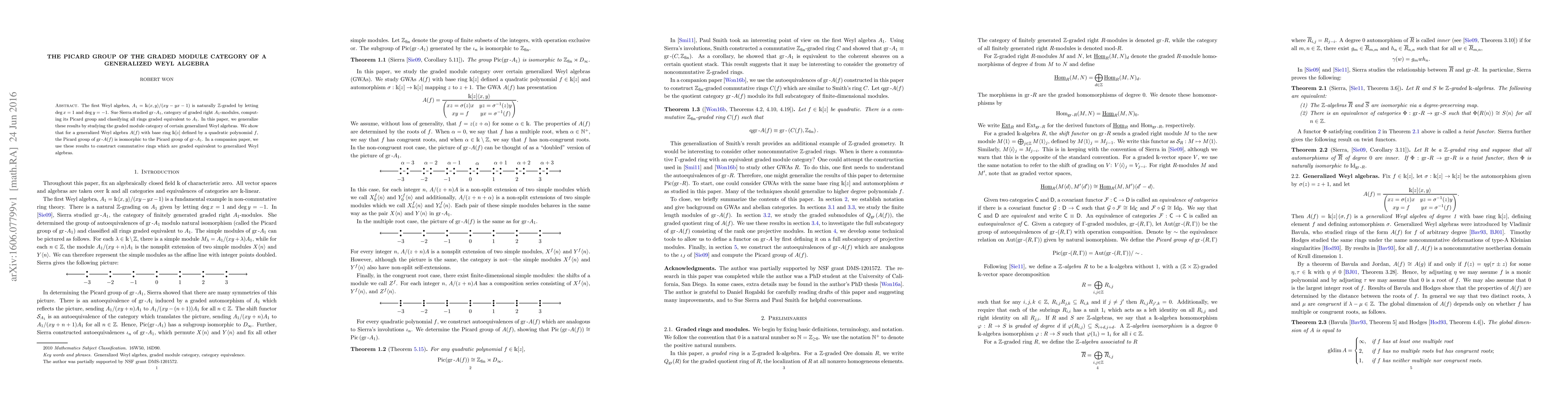 The first Weyl algebra, $A_1 = k \langle x, y\rangle/(xy-yx - 1)$ is naturally $\mathbb{Z}$-graded by letting $\operatorname{deg} x = 1$ and $\operatorname{deg} y = -1$. Sue Sierra studied $\operatorname{gr}- A_1$, category of graded right $A_1$-modules, computing its Picard group and classifying all rings graded equivalent to $A_1$. In this paper, we generalize these results by studying the graded module category of certain generalized Weyl algebras. We show that for a generalized Weyl algebra $A(f)$ with base ring $k[z]$ defined by a quadratic polynomial $f$, the Picard group of $\operatorname{gr}- A(f)$ is isomorphic to the Picard group of $\operatorname{gr}- A_1$. In a companion paper, we use these results to construct commutative rings which are graded equivalent to generalized Weyl algebras.