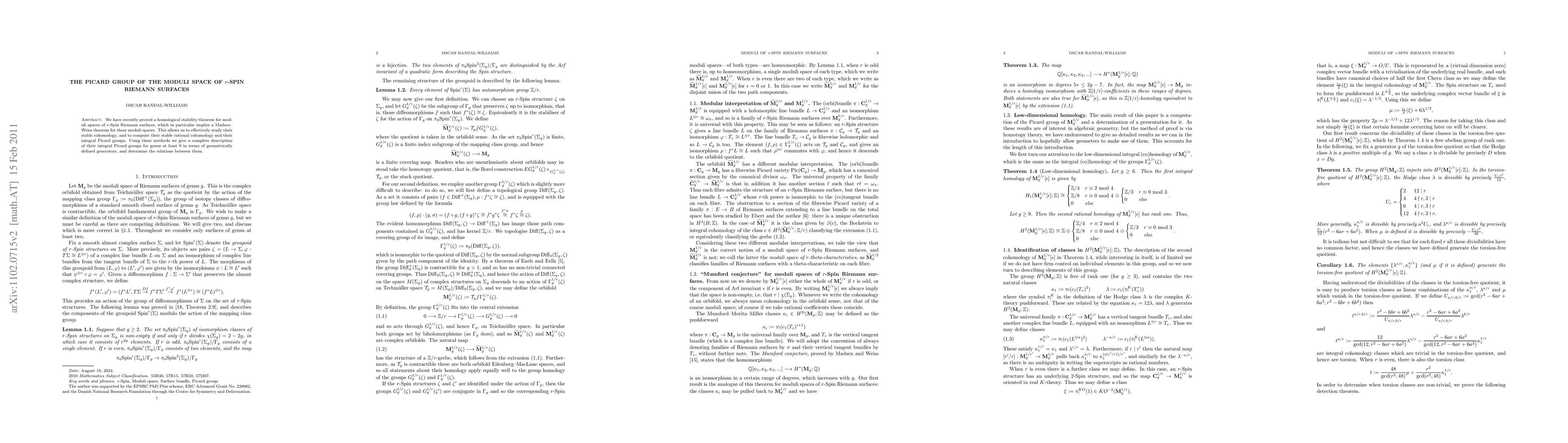 We have recently proved a homological stability theorem for moduli spaces of r-Spin Riemann surfaces, which in particular implies a Madsen--Weiss theorem for these moduli spaces. This allows us to effectively study their stable cohomology, and to compute their stable rational cohomology and their integral Picard groups. Using these methods we give a complete description of their integral Picard groups for genus at least 9 in terms of geometrically defined generators, and determine the relations between them.