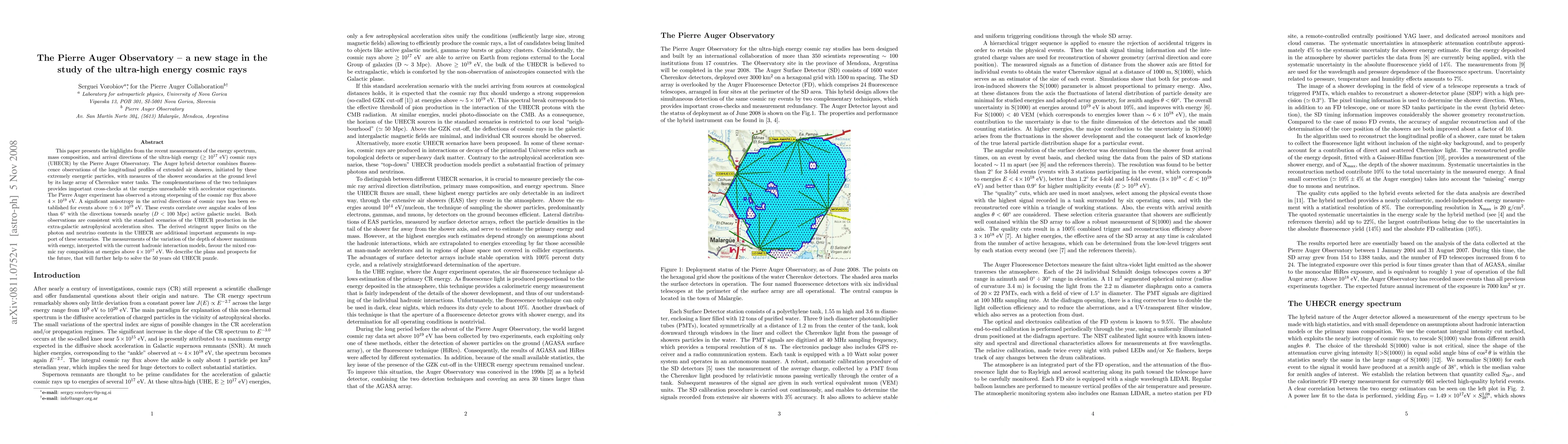 The Pierre Auger Observatory has measured the energy spectrum, mass composition, and arrival directions of ultra-high energy cosmic rays, revealing a steepening of the cosmic ray flux above 40 EeV and significant anisotropy above 60 EeV correlating with nearby active galactic nuclei. These findings support extragalactic acceleration sites and mixed cosmic ray composition at higher energies.
